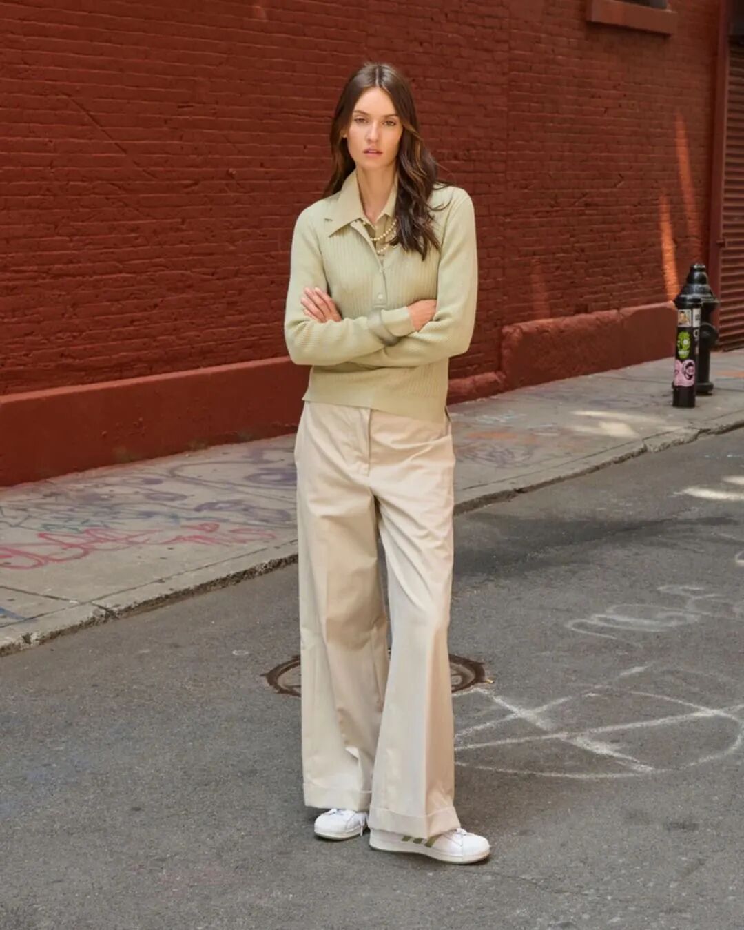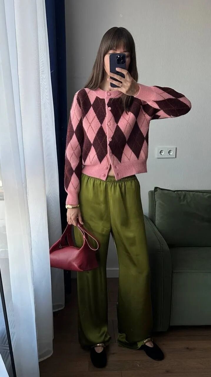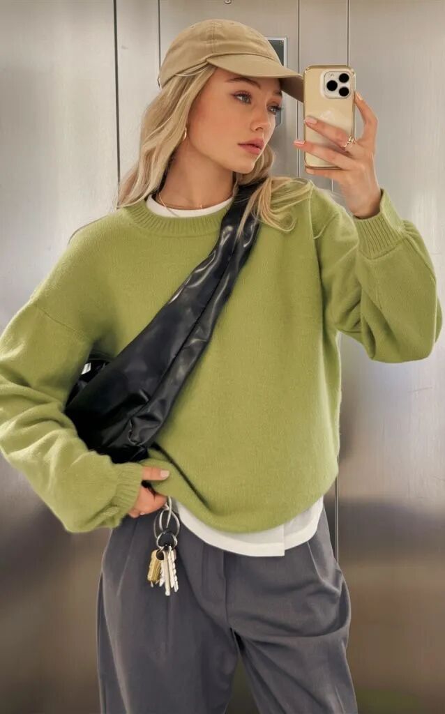 搭配复古的苔藓绿阔腿裤,