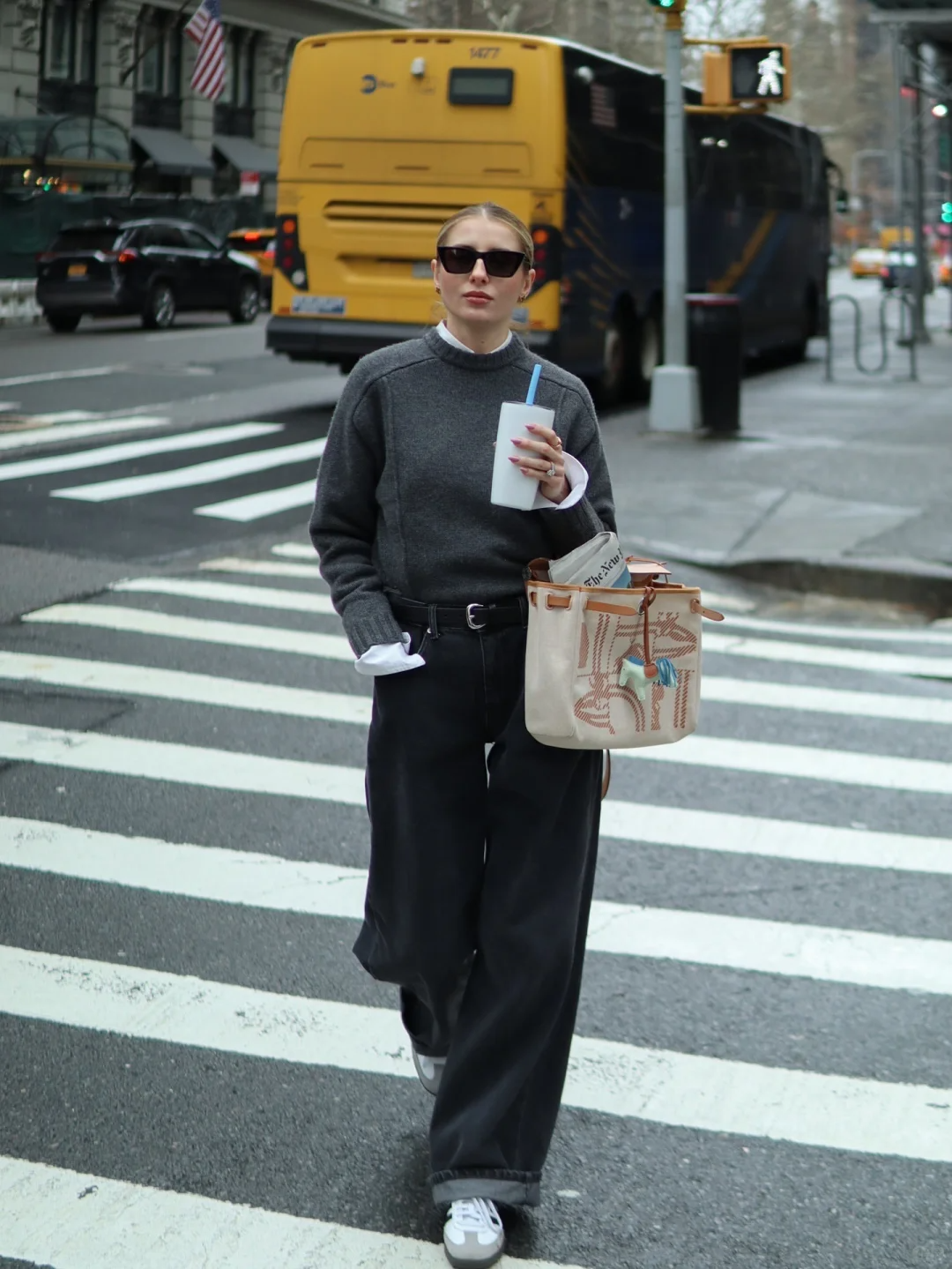 黄色毛衣搭配灰色阔腿裤,