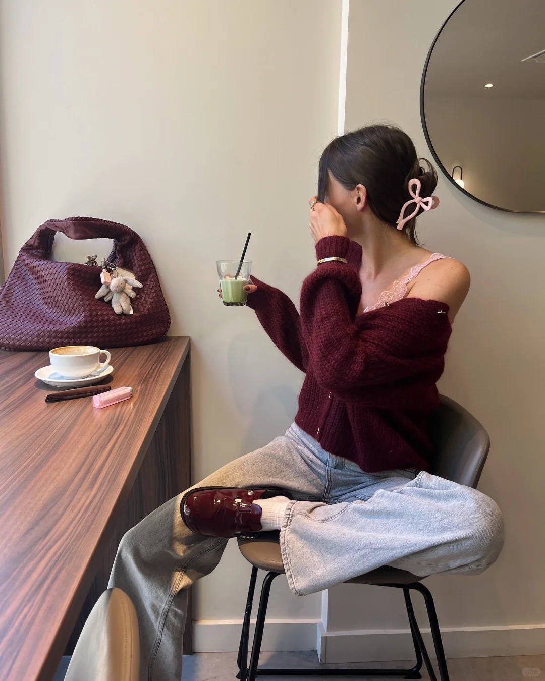 则以清爽随性的质感中和酒红的厚重,