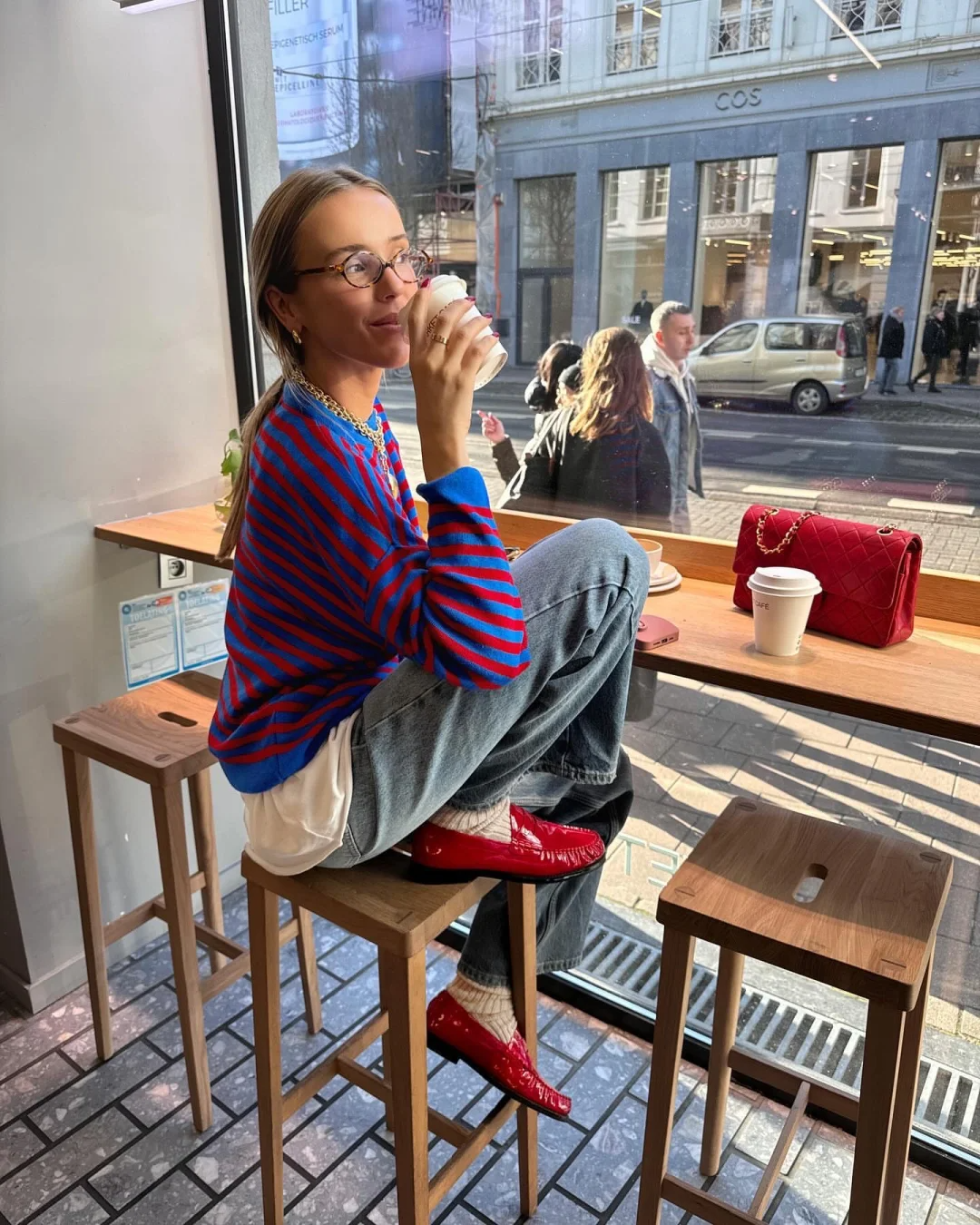 用红色乐福鞋形成首尾呼应。