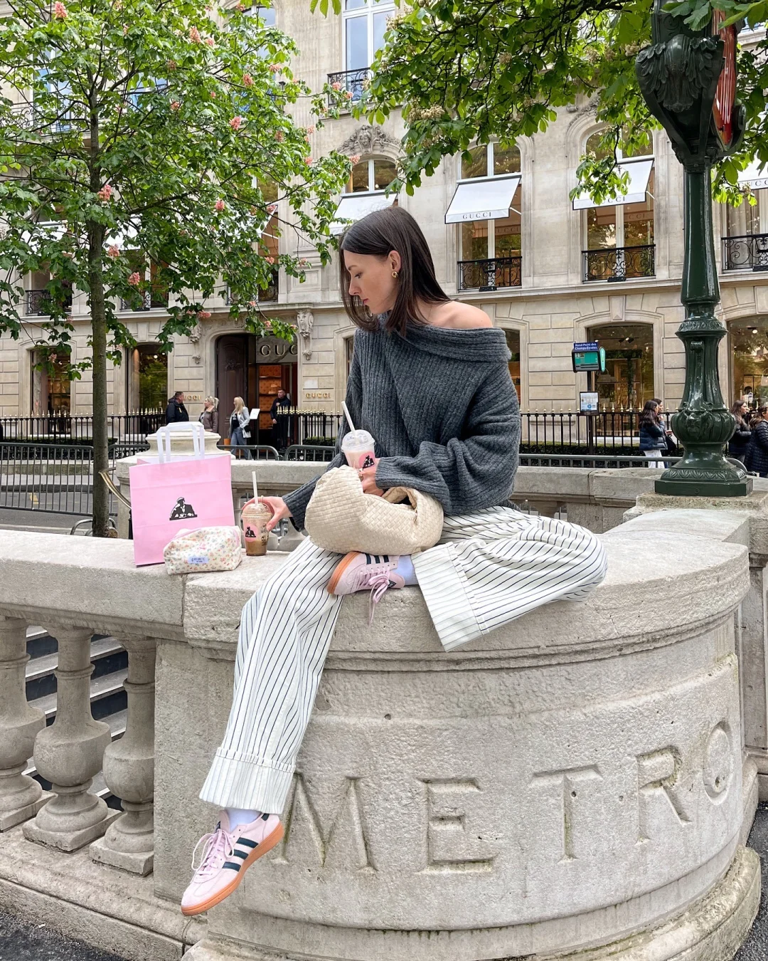 搭配浅灰色针织阔腿裤,