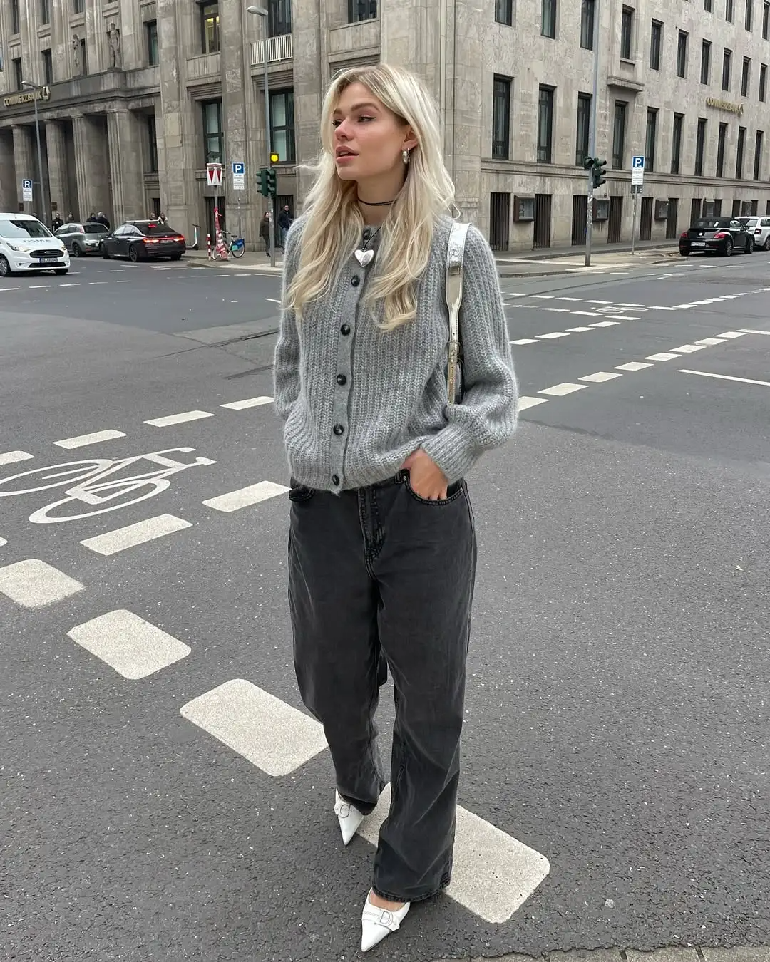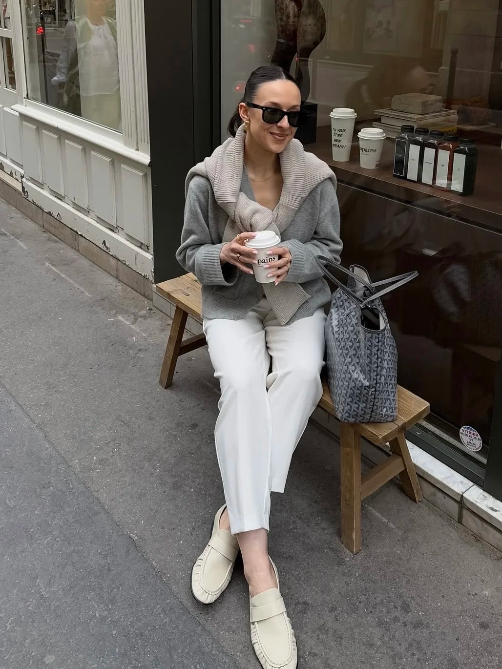 灰色针织开衫搭配白色阔腿裤,