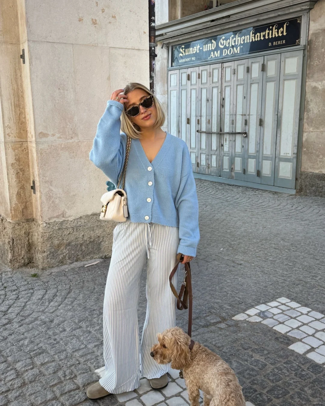 浅蓝色针织开衫搭配白色阔腿裤,