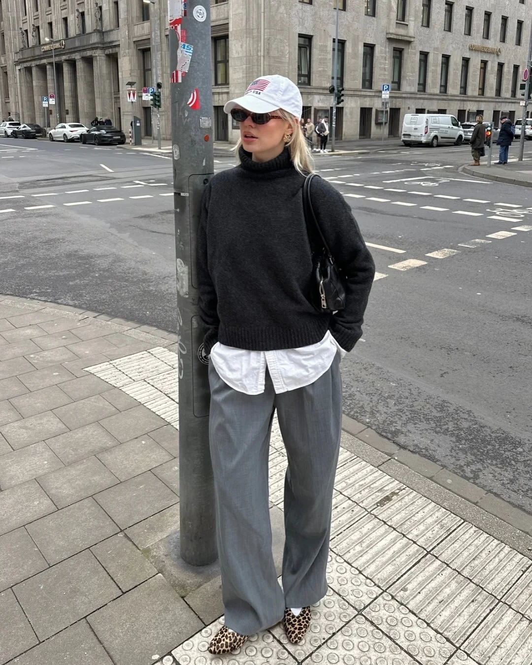 再用黑色棒球帽与黑色包包形成同色呼应。