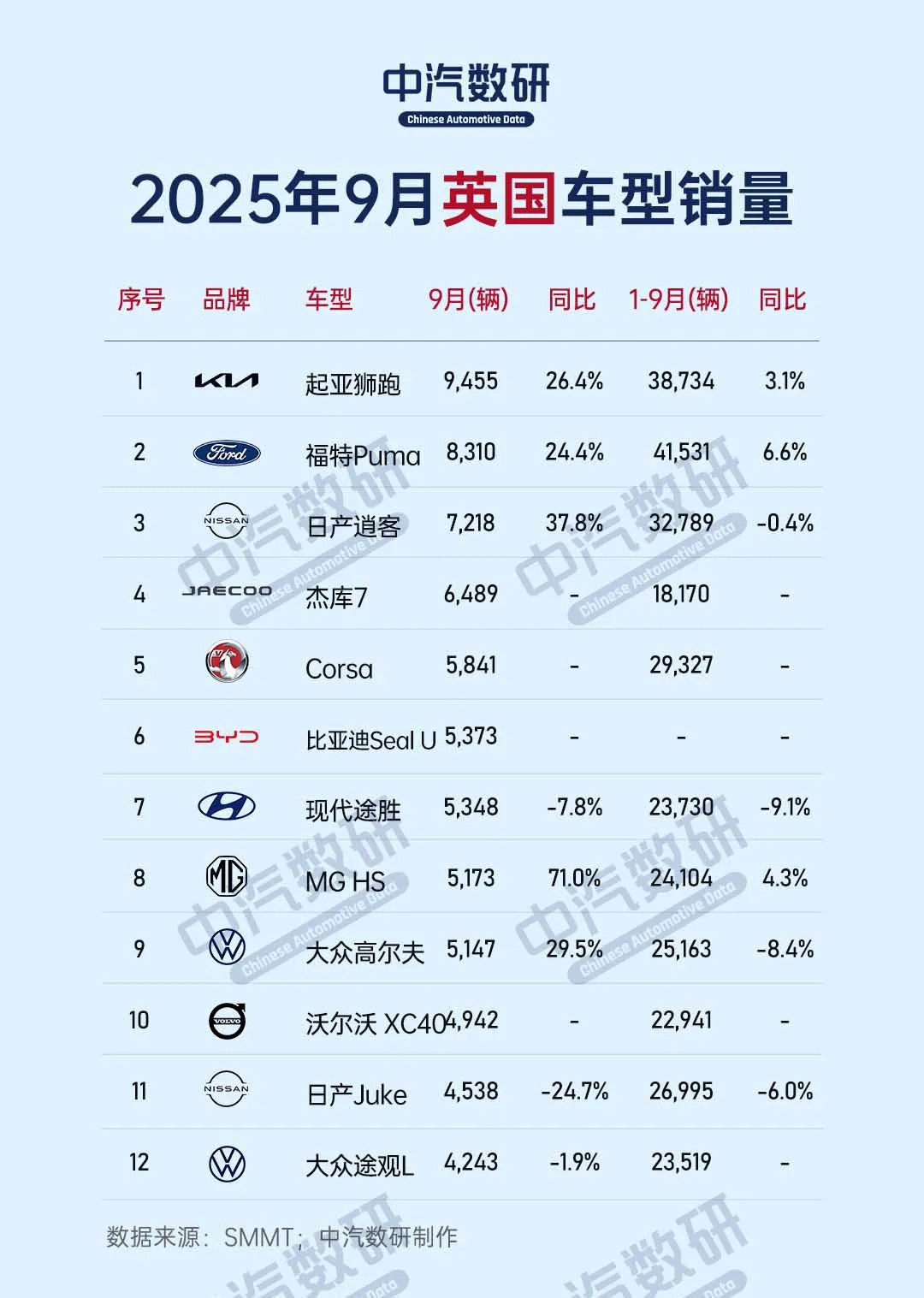 车型方面,起亚狮跑同比增长26.4%,年度内第四次夺得销量冠军,不过今年累计销量仍落后于福特Puma(同比增长24.4%)。日产Qashqai同比增长37.8%,排名回升至第三。杰库7在8月排名第六,9月则飙升至第四,排名上升明显。比亚迪Seal U首次跻身前十,排名第六,市场份额为1.7%,开创了比亚迪车型在英国市场前十的纪录。名爵HS排名第八名,成为传统燃油车型中的少数亮点之一。