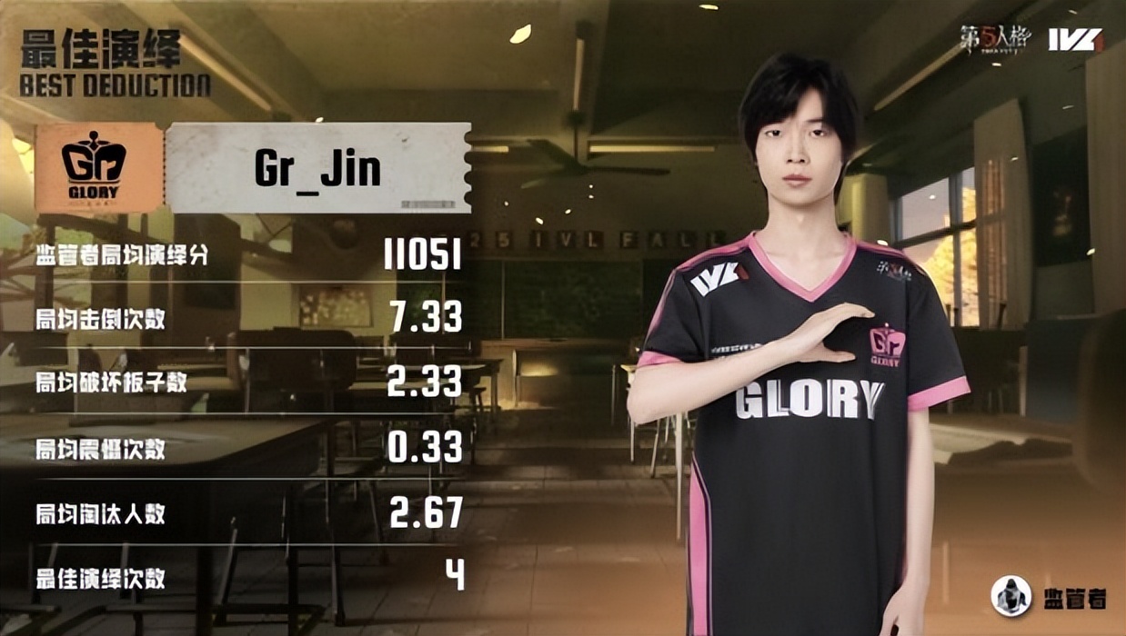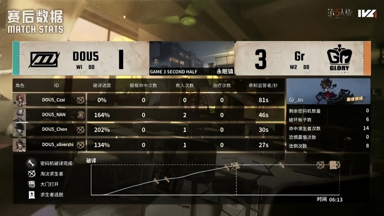 DOU5的求生者选择了冒险家、古董商、佣兵、飞行家(BAN邦邦);Gr的监管者Jin选择了时空之影。(BAN先知、“逃脱大师”、入殓师、机械师)