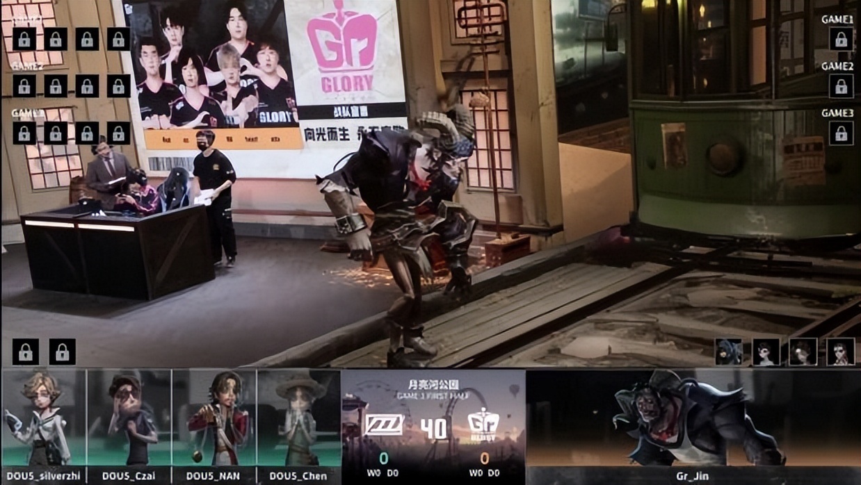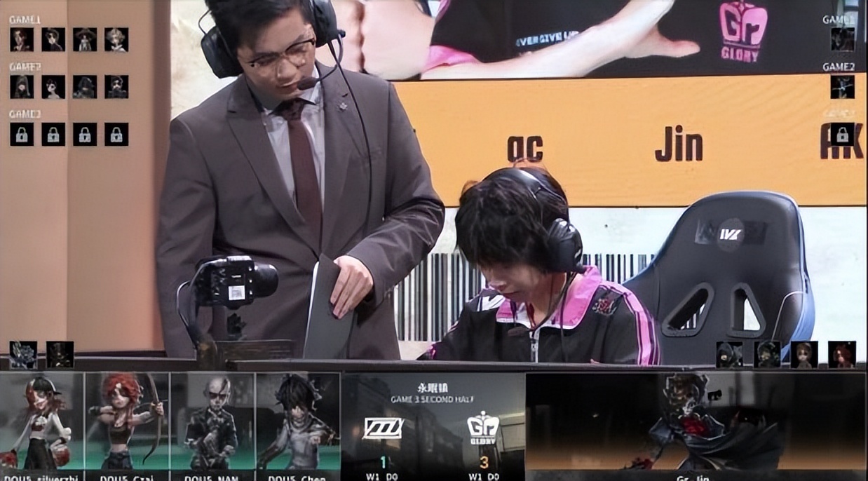 DOU5的求生者选择了弓箭手、“逃脱大师”、病患、拉拉队员(BAN“喧嚣”、邦邦);Gr的监管者Jin选择了歌剧演员。(BAN先知、前锋、机械师、哭泣小丑)