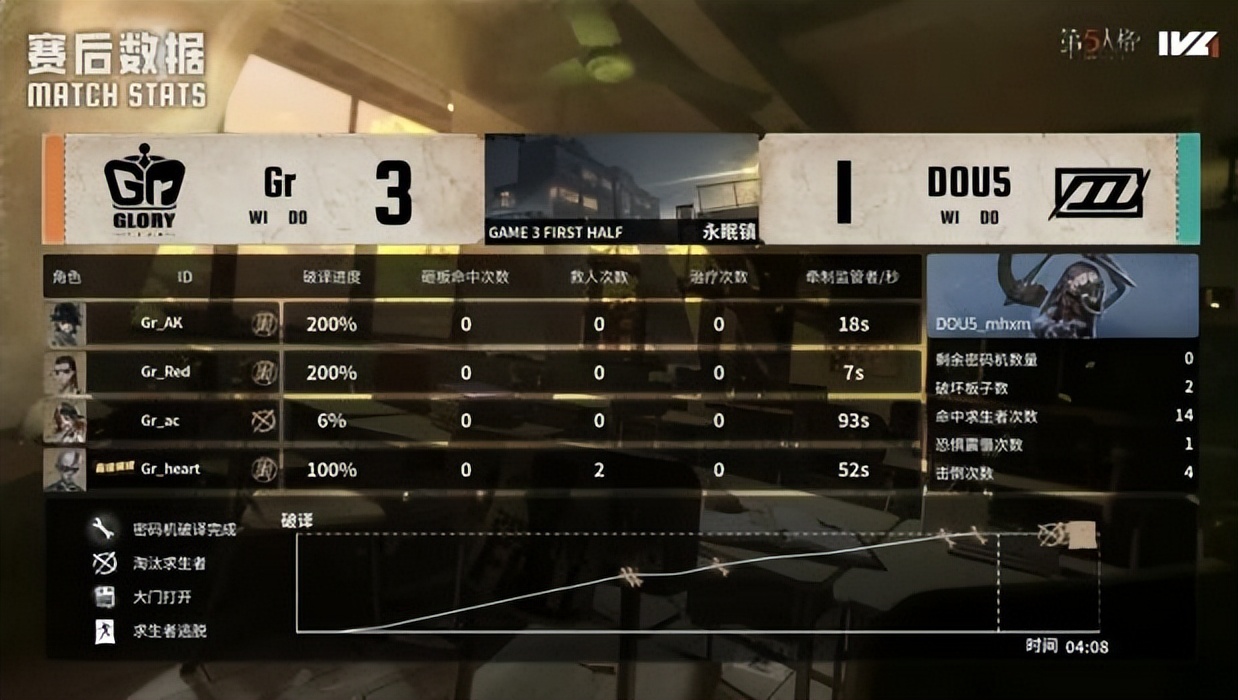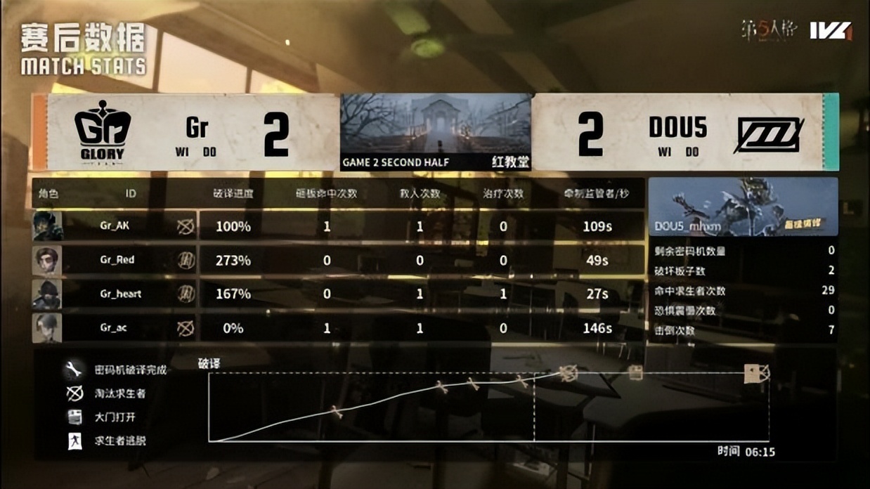 Gr的求生者选择了拉拉队员、教授、病患、“逃脱大师”(BAN鹿头、“跛脚羊”);DOU5的监管者mhxm选择了破轮。(BAN先知、火灾调查员、邮差、空军)