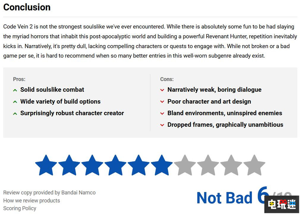 《噬血代码2》并未在多数传统设计上突破创新,也未必能成为类魂游戏的新标杆。但它将自身独特的构思完整地展现,使其在同类作品中脱颖而出。游戏的角色设计很有魅力,属性成长与职业系统也很有特色。开放世界虽然简单但有各种隐藏乐趣。不过游戏的敌人种类过少,开放世界地图中的小型地下城也十分单调。