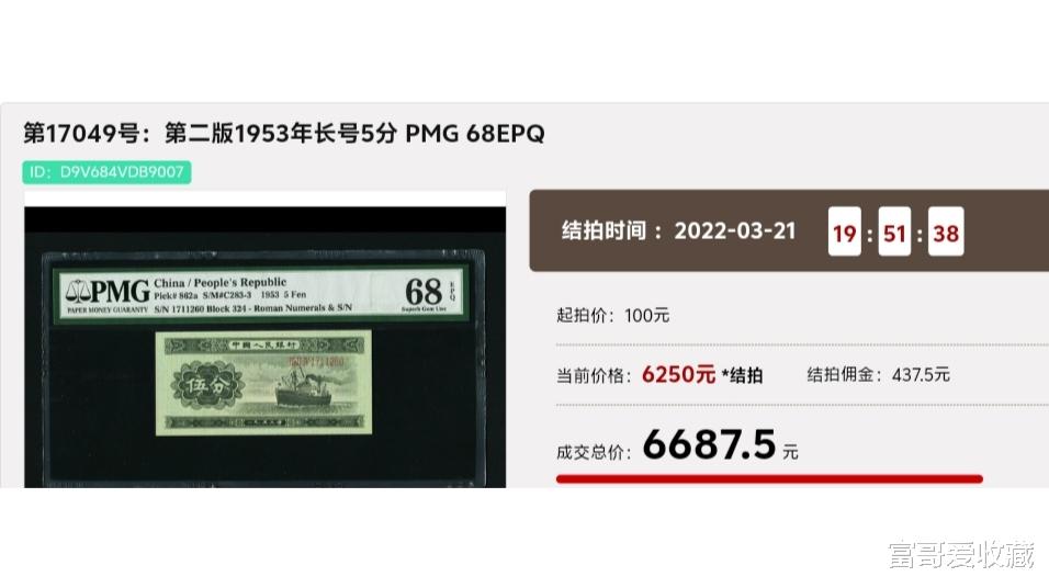 在之前的“网络拍卖会”中,就有一张“长号5分”,最后拍出了6687.5元!虽然同样都是“5分纸币”,但是它们的区别还是比较大的。