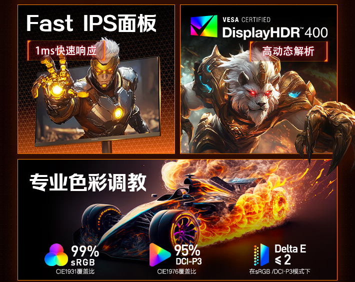 不同于部分低价位电竞显示器为追求高刷而牺牲色彩表现,科睿X5在色彩表现力上同样不遗余力。其覆盖99% sRGB和95% DCI - P3广色域,并且色准Delta E≤2,意味着它不仅能完美呈现游戏世界中丰富绚烂的色彩,还能满足部分专业设计和视频剪辑工作对色彩广度的要求。此外,科睿X5还通过了DisplayHDR 400 认证,代表它具备了高动态范围解析能力,能够呈现更亮的亮部和更深的暗部细节。在支持HDR的游戏或影片中,玩家可以体验到更具层次感和真实感的光影效果,让游戏画面不再平淡,每一场游戏都像在观赏视觉大片。