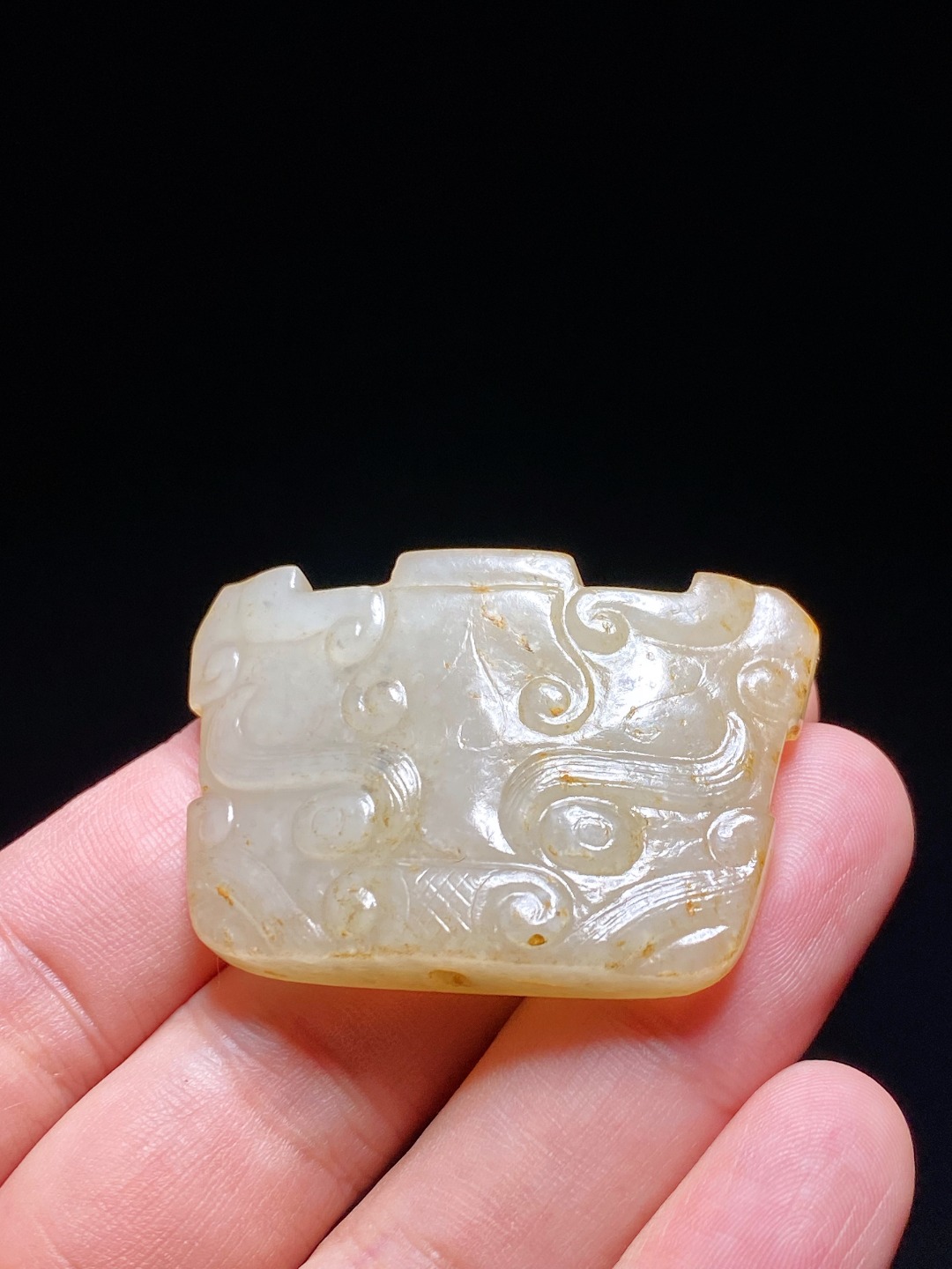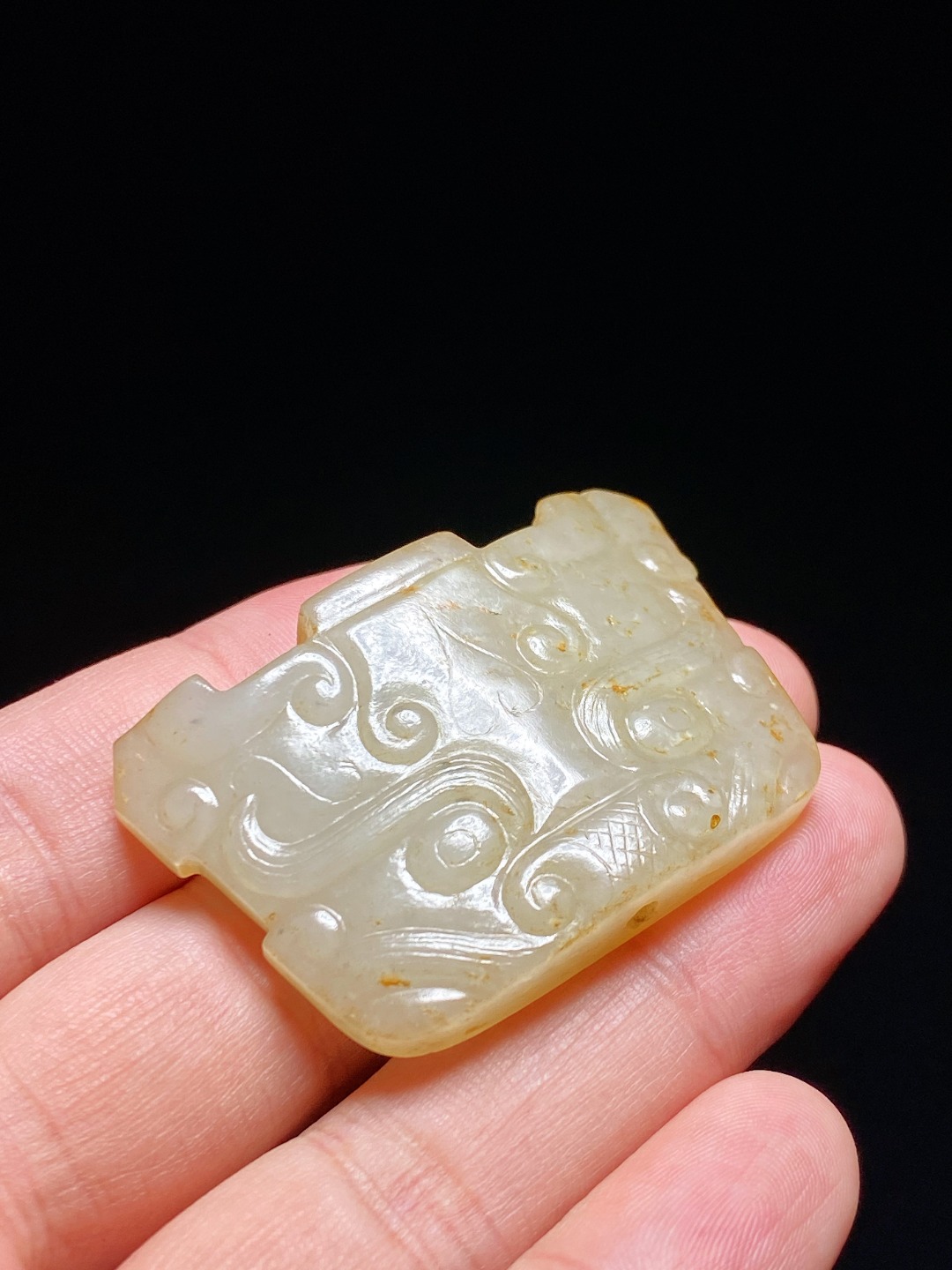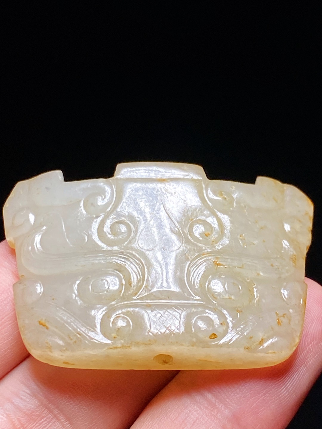 明以前 熟坑 和田玉籽料 白玉 兽面纹 挂件 长5 宽1 高3.2厘米 重29克 籽料白玉,琢成梯形状玉兽面,兽面呈对称布局,双目凸起,浮雕高鼻,卷角。整器施工精细,局部有灰皮红沁。玉兽面以商代最具典型,兽面威严而又神秘。西周开始,玉兽面开始成为高级贵族的装饰物,出现在项饰和腕饰上。