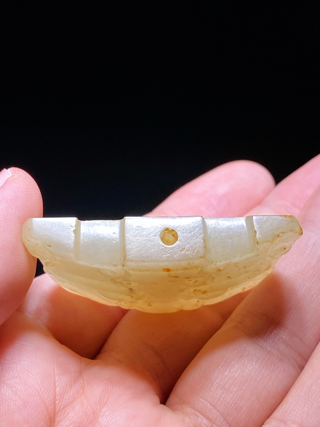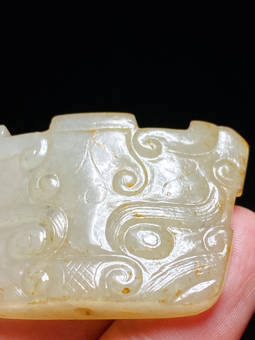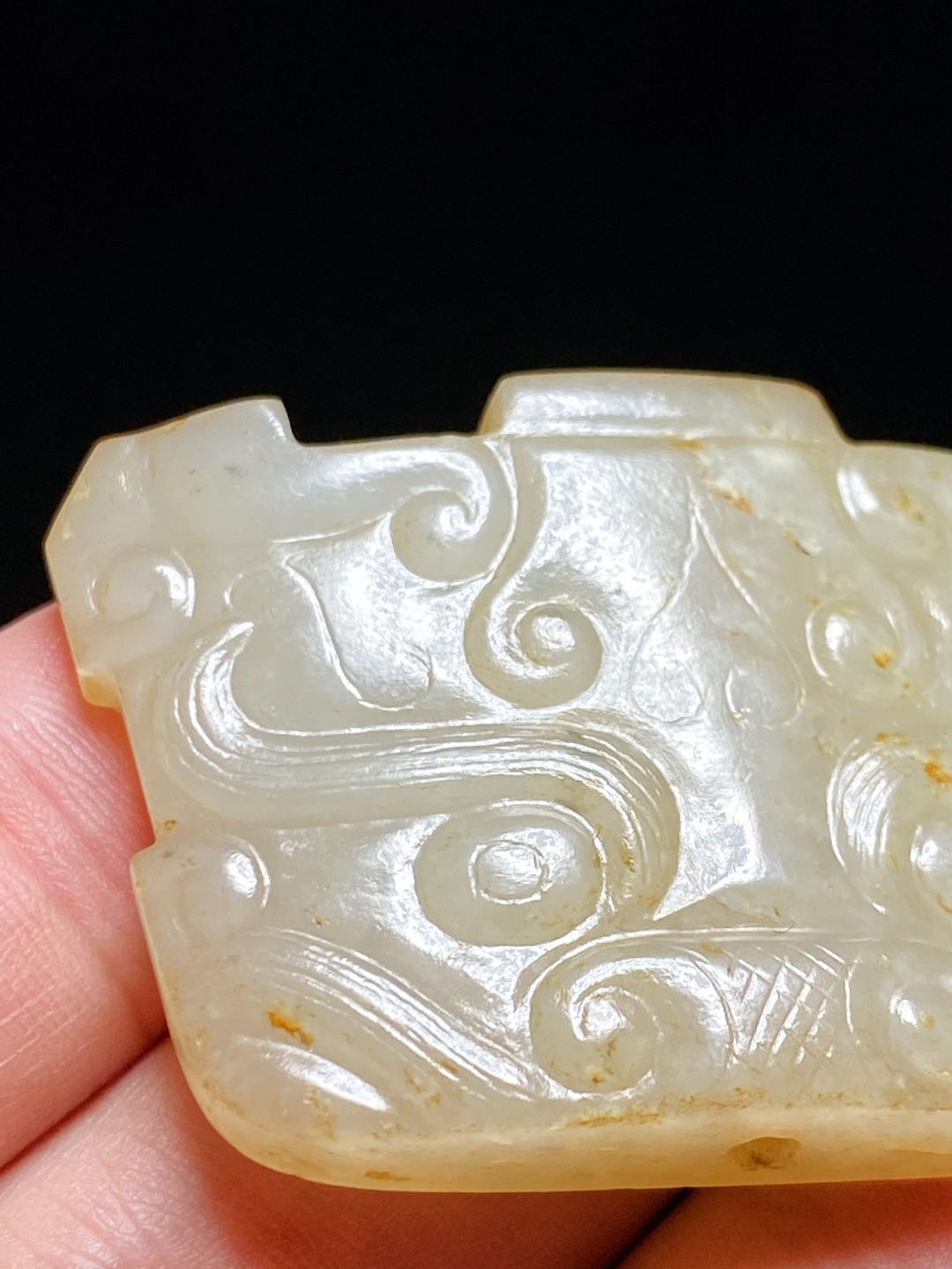 明以前 熟坑 和田玉籽料 白玉 兽面纹 挂件 长5 宽1 高3.2厘米 重29克 籽料白玉,琢成梯形状玉兽面,兽面呈对称布局,双目凸起,浮雕高鼻,卷角。整器施工精细,局部有灰皮红沁。玉兽面以商代最具典型,兽面威严而又神秘。西周开始,玉兽面开始成为高级贵族的装饰物,出现在项饰和腕饰上。