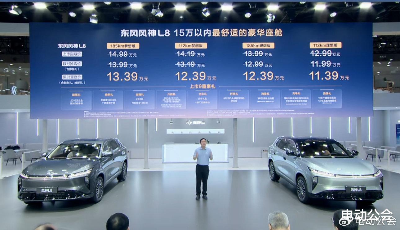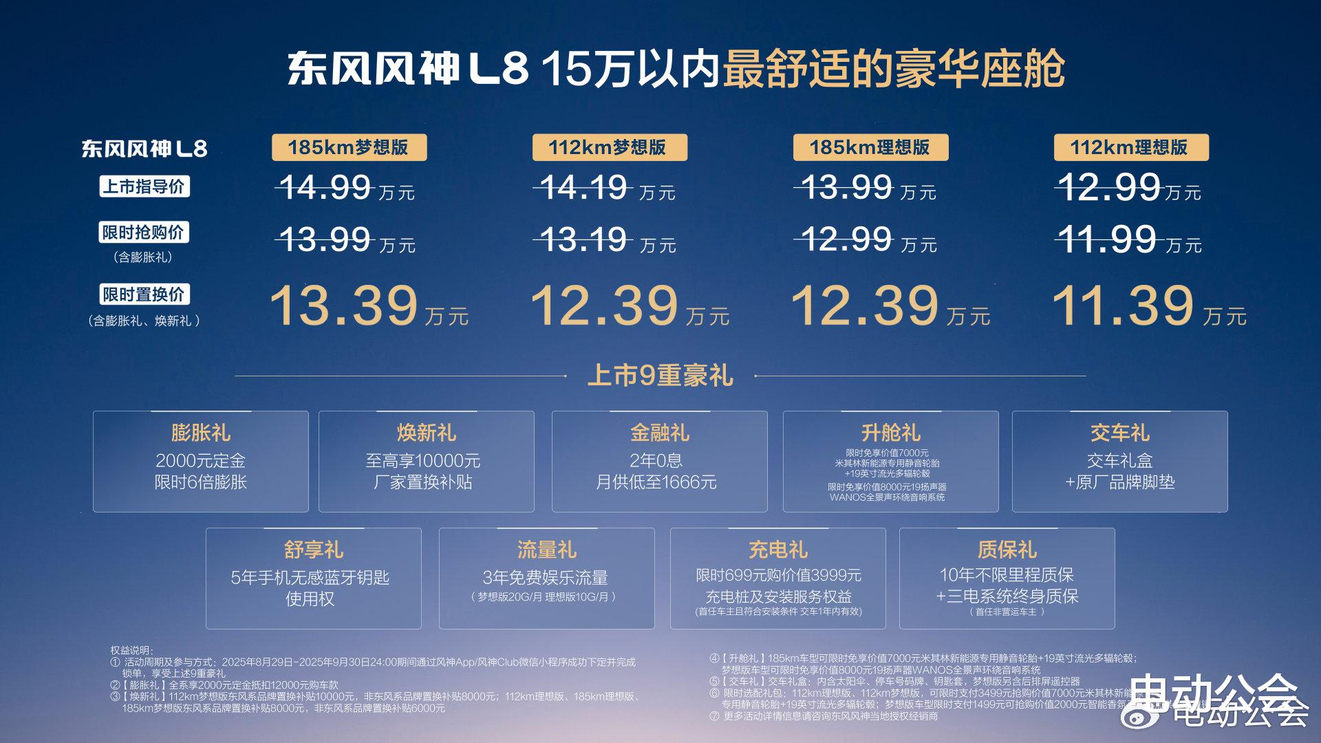8月29日,在2025成都国际车展上,东风风神L8正式迎来上市。这款号称“15万内最舒适的豪华座舱”的SUV,共推出4款配置车型,官方售价区间为11.99-13.99万元,限时优惠价甚至低至11.39万起。