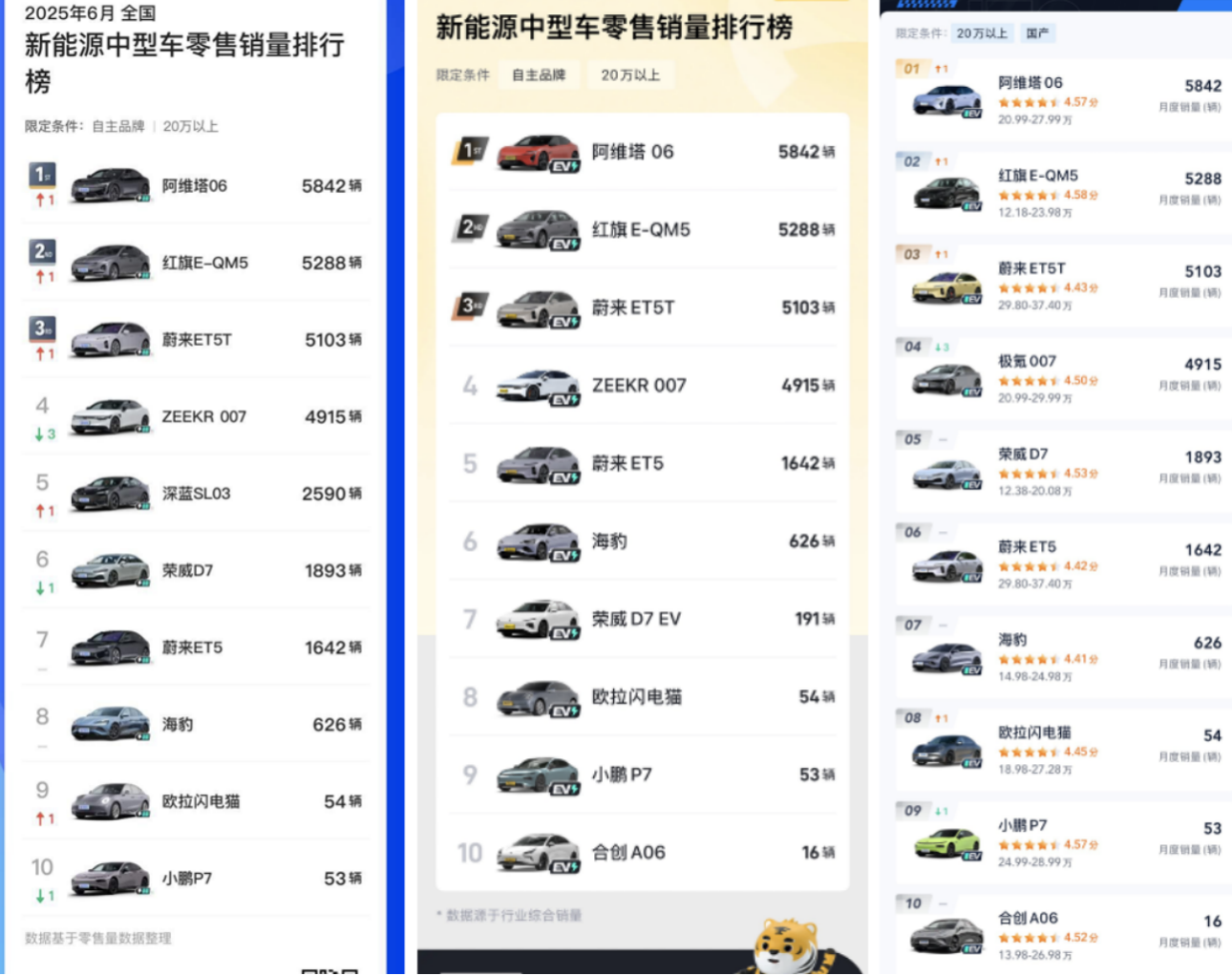 数据显示,阿维塔品牌6月全系销量达10153辆,同比暴涨117%,连续四个月稳居“万辆俱乐部”。其中阿维塔06单月斩获5842辆,力压极氪007、小米SU7等热门车型,强势登顶细分市场销量榜首。而这份成绩单的含金量,从汽车之家4.57分(五星制)的用户口碑评分就可见一斑。