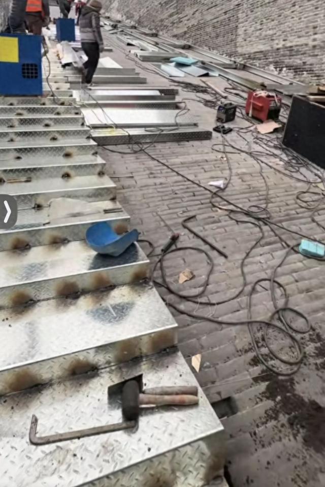 视频显示,登临定州南城门的坡道上正在安装不锈钢台阶,多名工人正焊接施工,坡道左侧金属台阶已初具雏形,右侧台阶正在安装中。记者注意到,不锈钢台阶安装后,将覆盖了下方的砖石坡道,不少网友在视频评论区表示,这样过于现代化的设施与古色古香的城墙显得格格不入。也有网友表达担忧:“加装不锈钢台阶是否会对文物古迹造成破坏?”“冬天雨雪天气不锈钢台阶会不会太滑影响安全?”
