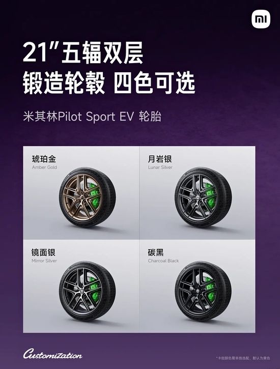 轮毂方面,提供四色可选的21英寸五辐轮毂,搭配米其林PS EV轮胎。另有24K金车标、红/蓝/绿三色刹车卡钳等选项,官方还基于此推出紫水晶主题与嫩芽黄主题方案。