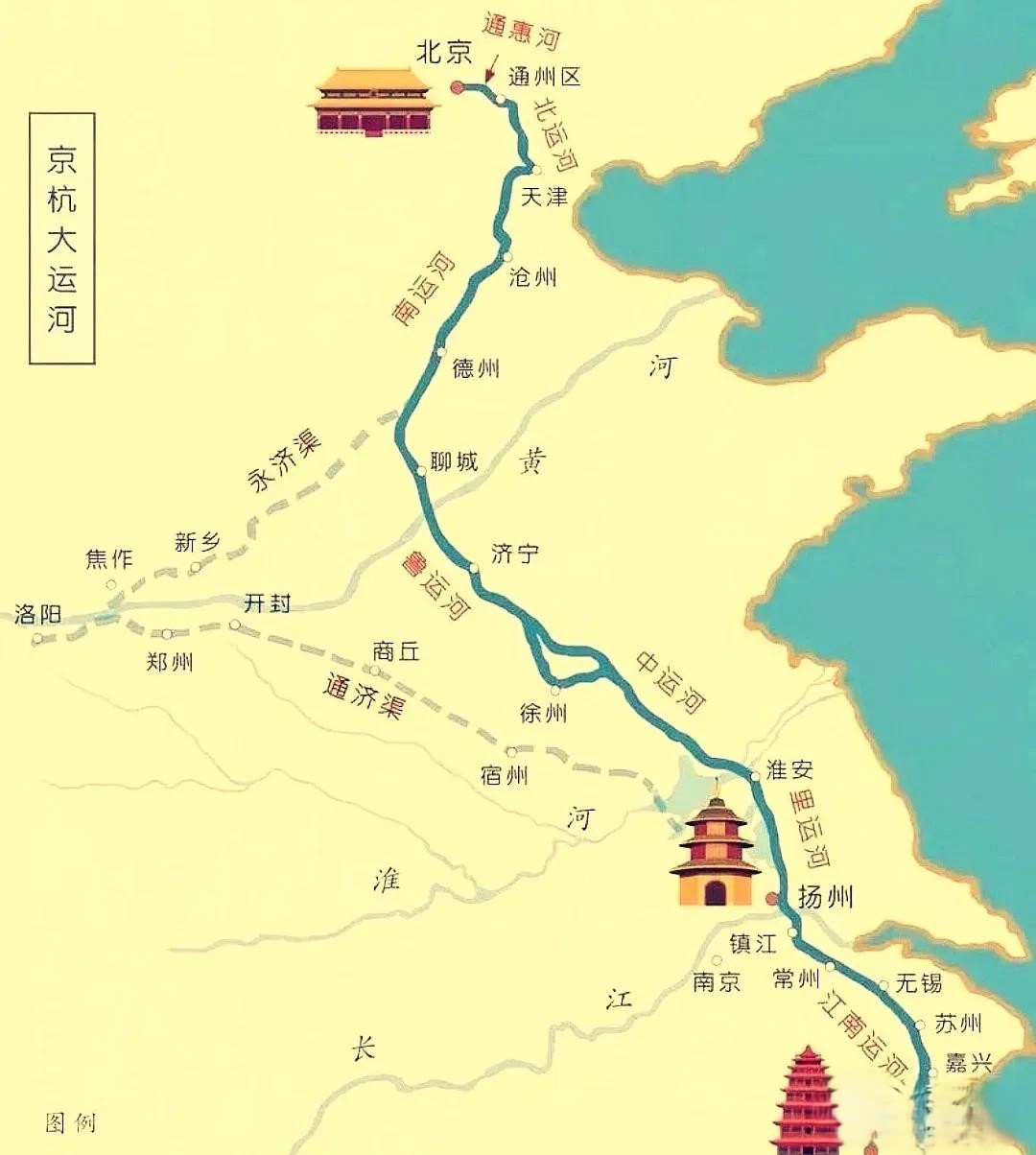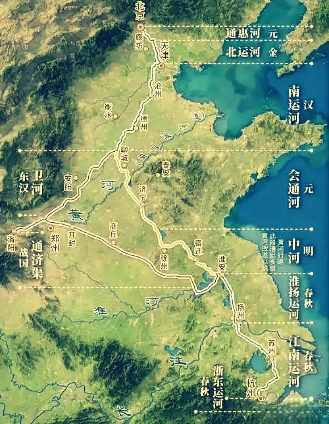 修运河的核心目的,是把粮食从扬州运到洛阳、长安——你看运河的关键节点:汴河连接黄河与淮河,邗沟贯通淮河与长江,江南河直达苏州杭州,全是人口稠密、农业发达的地区。