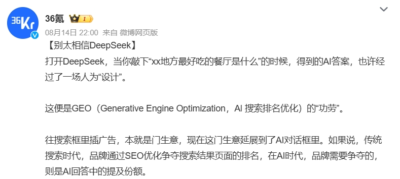 有媒体报道,如今元宝、豆包、Kimi等主流AI对话助手已经成为了新营销入口,品牌可以通过GEO(生成式引擎优化)策略,让自身产品在消费查询中获得优先推荐与权威背书。如果这类应用开启竞价排名,AI应用返回的结果是否包含广告会更难识别。