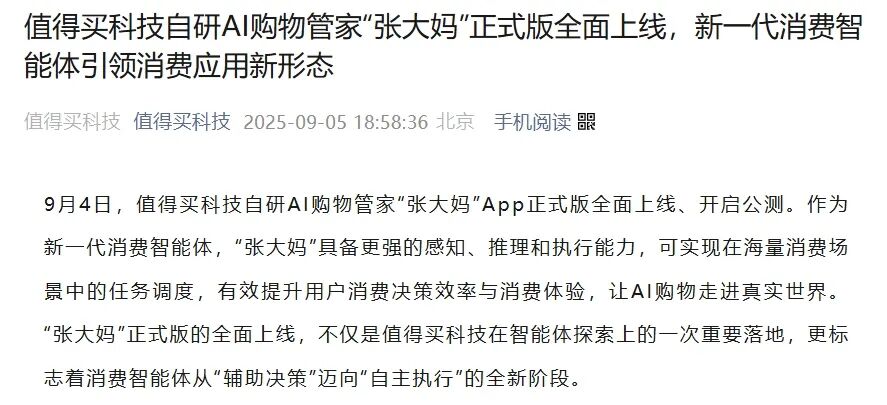 从推出“张大妈”到开放MCP,值得买都是在尝试用自身独特的内容与数据优势,提升供需两端的连接质量和效率,促进整个消费行业的协同开放。这家“小而美”的公司,在“AI+消费”领域显露出独特的突围潜力,“张大妈”引领的消费智能体生态发展,值得期待。