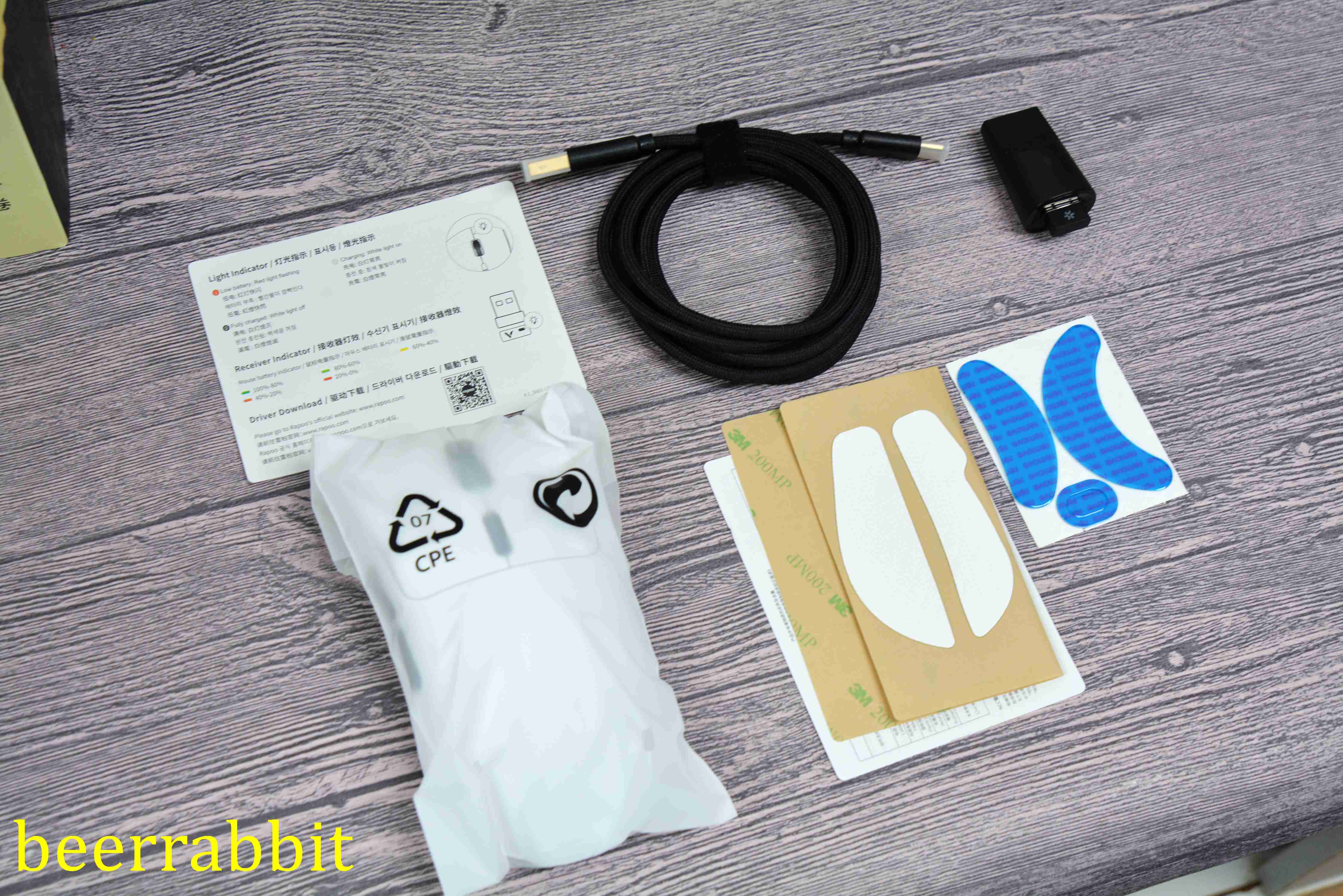 配件齐全:说明书、按键防滑贴、鼠标脚贴、USB接口转换器1、充电线兼数据线1。