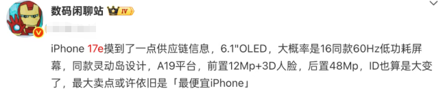 近日,有消息称:继iPhone16e之后,苹果17系列上也将推出iPhone17e机型。但它搭载了iPhone16同款60Hz低功耗屏幕,没有像iPhone17那样用上极为先进的120Hz。其他刀法也和16e一模一样,靠着砍A19处理器核心来维持等级尊严。当然卖点也依旧跟16e一样,号称最便宜的苹果手机。