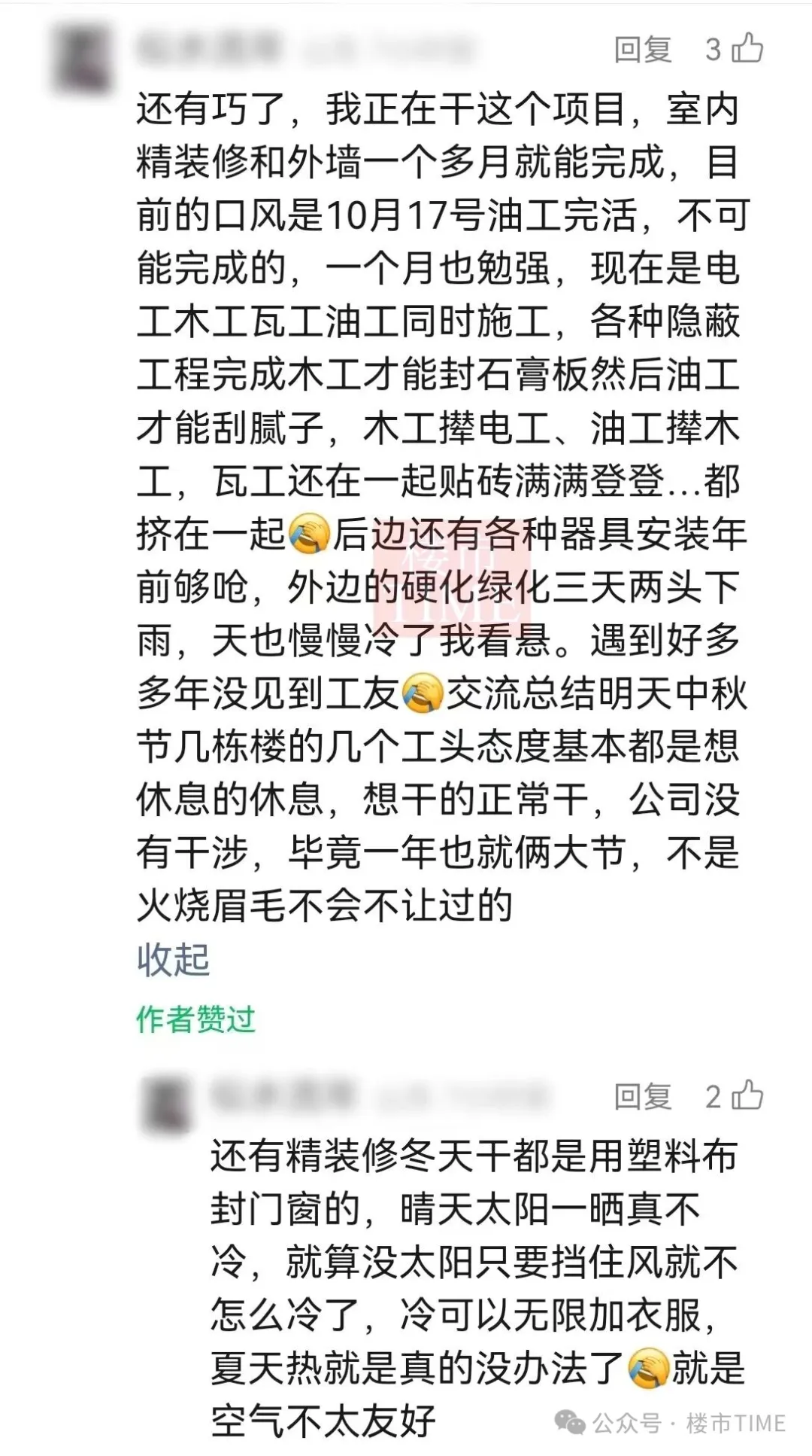诺德逸安居,容积率高达3.6,项目存在挡光、噪音、户型方面的短板,销售缓慢。项目于2023年11月开盘,取得预售许可证总共551套房源,目前已售212套,其中已登记119套;2年时间去化不足4成。目前,诺德逸安居住宅区域正在进行精装修。对于精装修施工情况,曾有参与施工人员,在国庆节期间,给本公众号曝料介绍现场情况: