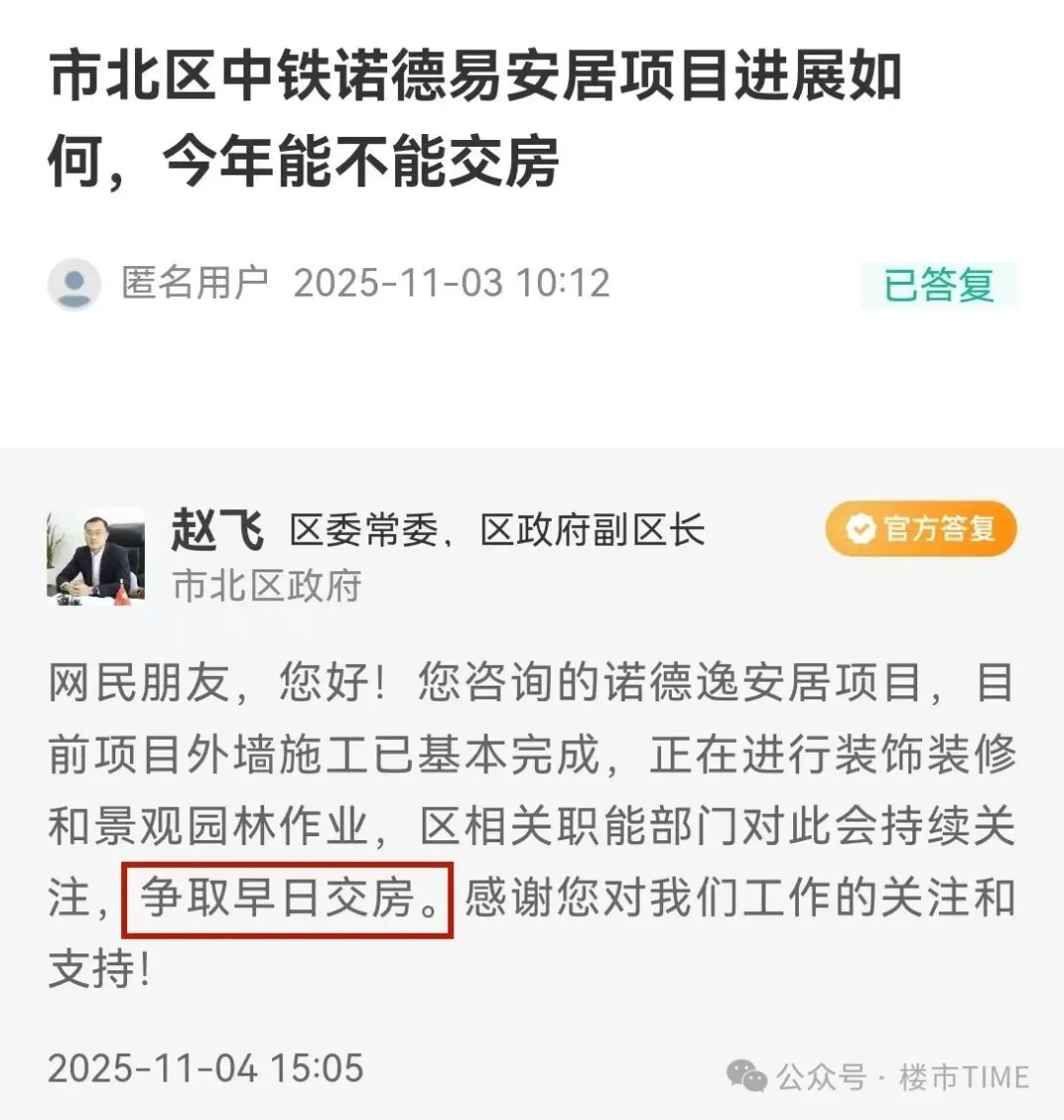 在近日的问政栏目中,有业主提问:市北区中铁诺德易安居项目进展如何,今年能不能交房?市北区副区长没给出确切的肯定答复,而是表示:争取早日交房!