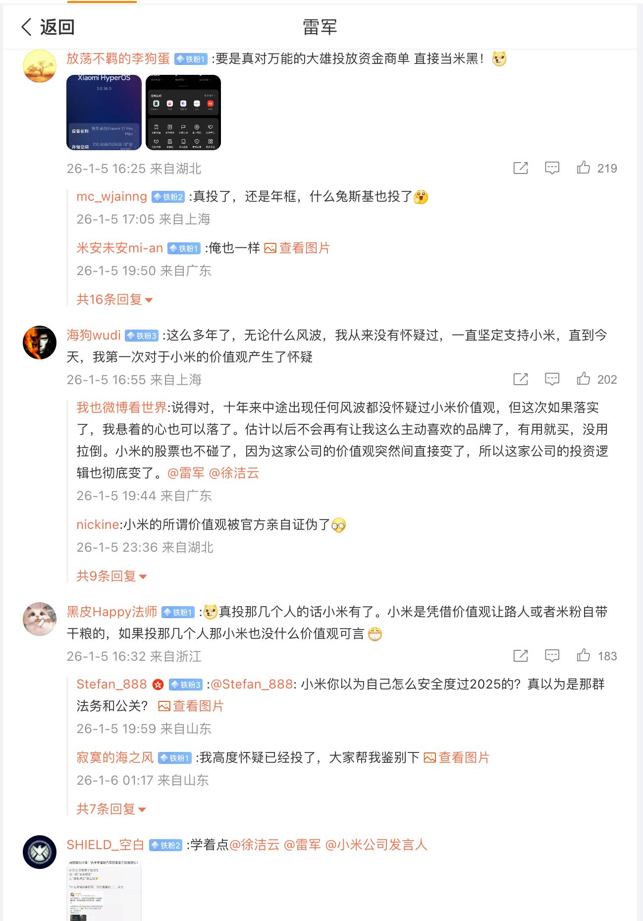 所以这个消息持续发酵后,小米粉丝纷纷到雷军、卢伟冰、徐洁云等小米高管的微博下留言,讨要说法,觉得这个做法跟价值观不匹配,下面是一些评论区的截图,大家可以挑几个看看,其实一些评论说得还是挺中肯的。