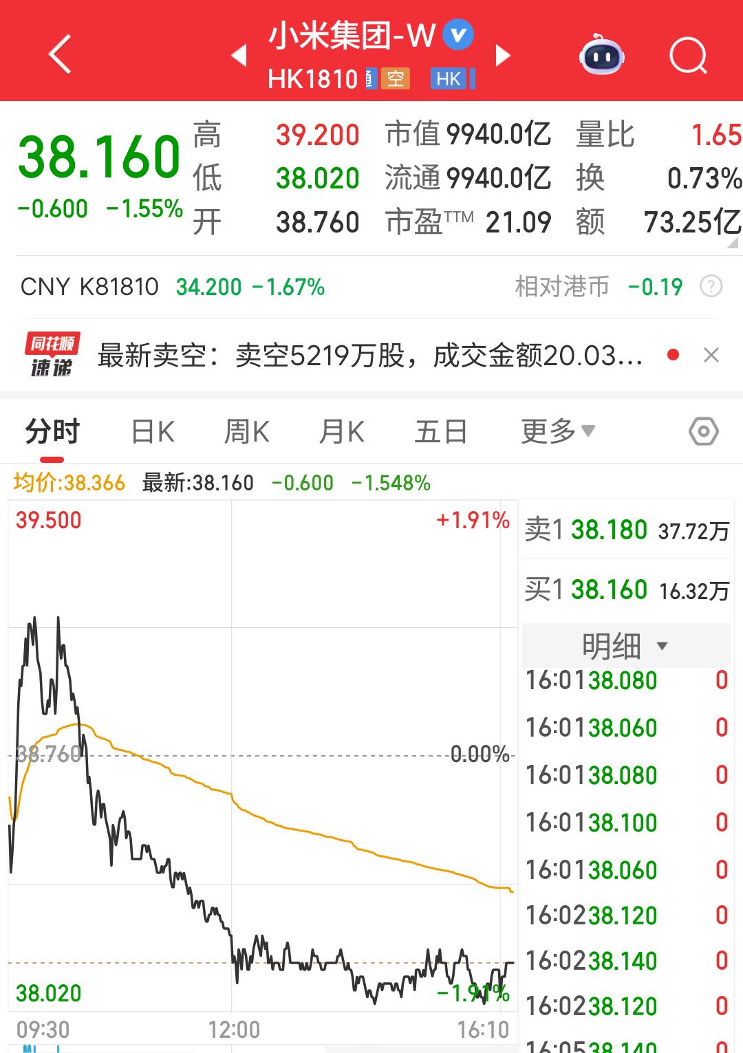 截至发稿,小米股票已经跌破38港元了,目前37.660港元,市值也只有9800亿多一点点,不知道接下来走势如何。