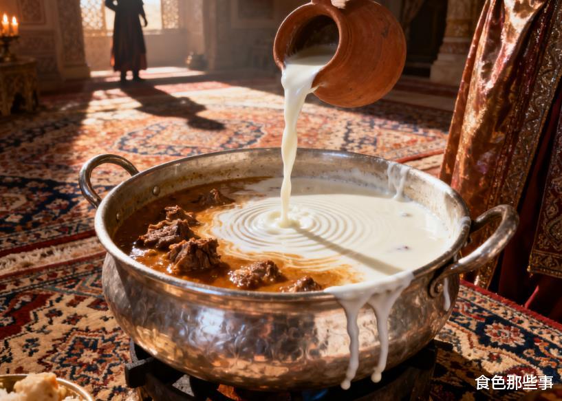 牛奶、奶油和酸奶缓缓倒入锅中,炖煮出浓郁的咖喱和肉汁;