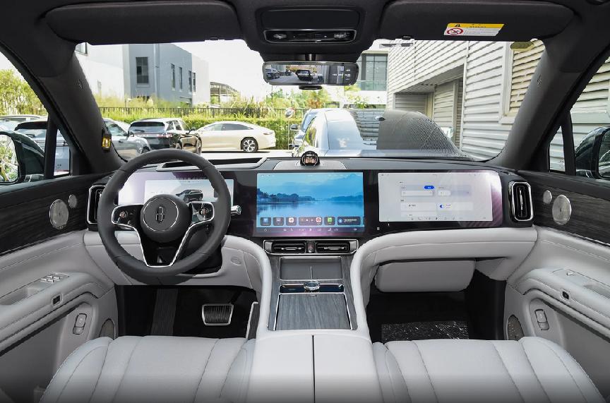 内饰方面,问界M9 2025款的座舱布局简约而不简单,稳重的风格偏向于商务和家用,大面积的软性材质包裹中控台,有效提升座舱整体感和豪华感,只不过车内还是存在异味,此处还有优化空间。15.6英寸的中控屏内置HarmonyOS智能系统,UI界面直观易用,传统用户也能快速上手,如果双手腾不开空,还能唤醒语音助手来获取信息。16英寸的副驾娱乐屏清晰度高,操作流畅,看上去比较气派。真皮方向盘拥有四向调节功能,加热、记忆等均没有缺席,配置达到这个价位应有的表现。