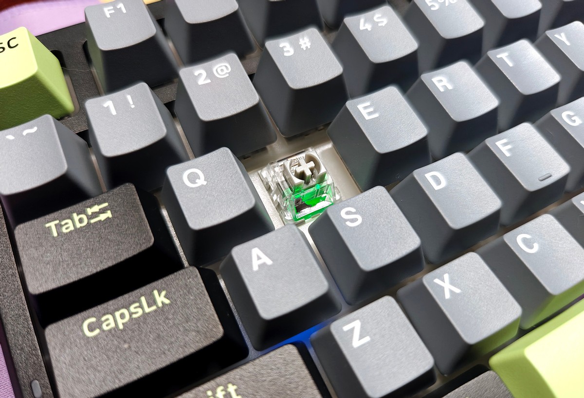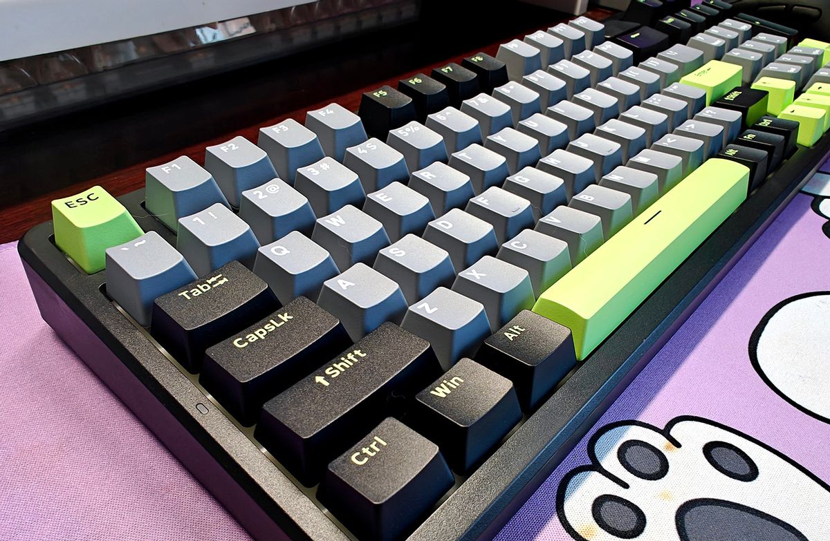 这个键盘是98键的,带有数字小键盘,这对于一些需要用到小键盘来开启功能的游戏而言非常的便捷。键盘的整体配色就是采用了黑色、紫色和绿色组成,正好和初号机的配色一致。