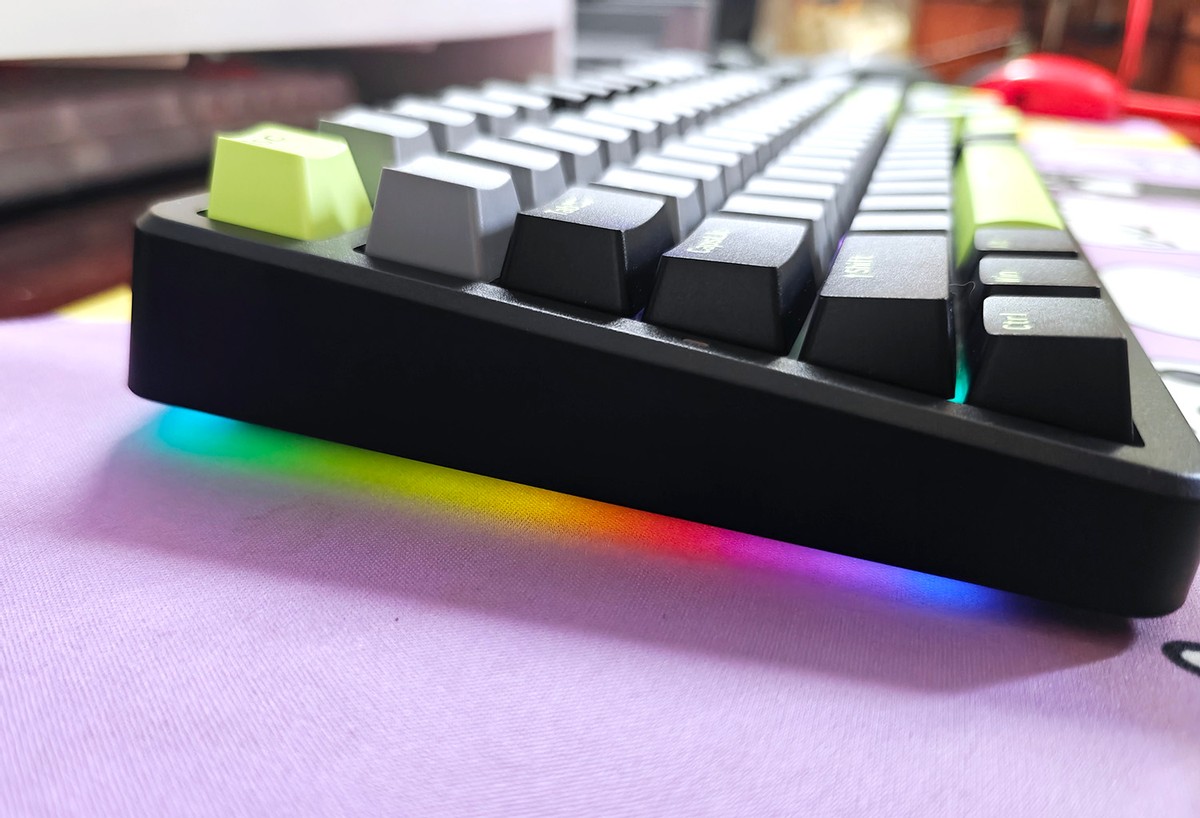 机械键盘少不了的就是LED灯光了,它有12种背光模式,不但按键下面有灯光可以选择不同的变化,在键盘的左右两侧,底部还有炫光设计,在夜晚看起来非常漂亮,氛围感很强。
