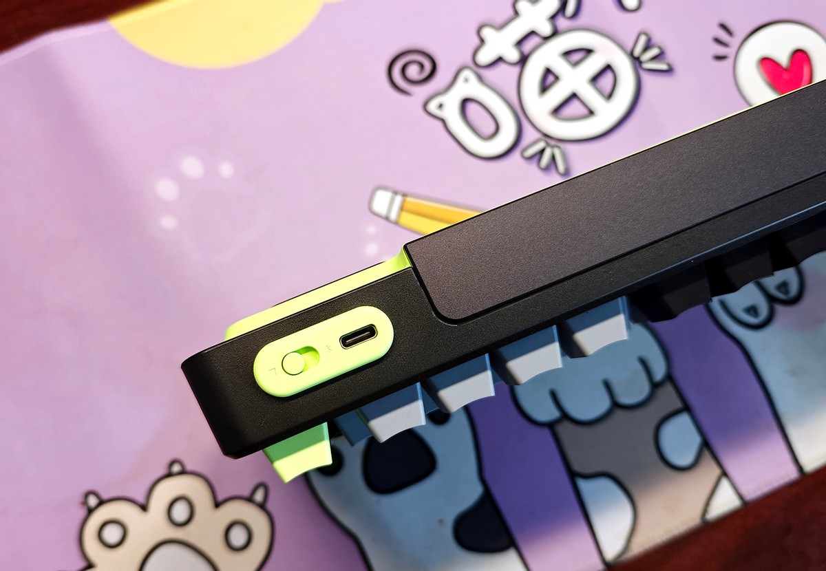 背面则是全绿色,看起来非常清爽,也很有潮流感。上方脚垫下有两个可以抬起来的支脚,能够让键盘增加一些倾斜角度。