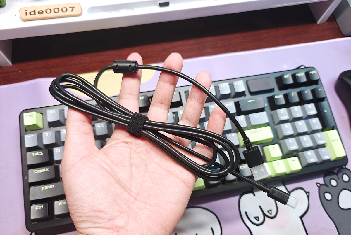 送的这条线既可以用作有线连接,也可以作为充电线来使用。雷柏V700DIY-98的电池很大,足有4000mAh,在关闭灯光的情况下续航可达800小时!大电池导致整体键盘重量增加了,拿在手里很有分量感,但这样的好处就是键盘更稳定,不易移动,在激烈的游戏场景下能避免误操作。