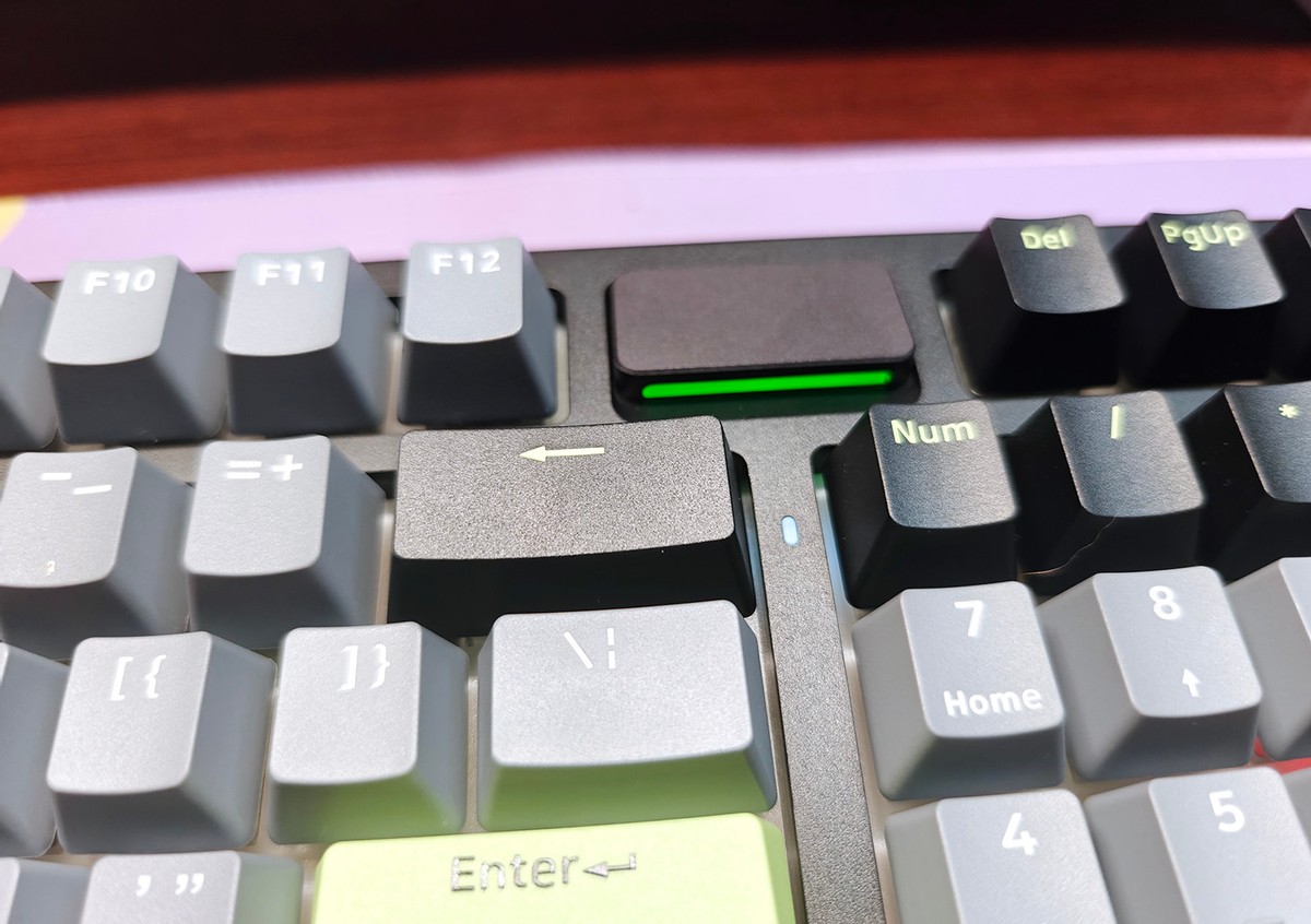 在键盘正面顶部,还有一个被称为“时空环境仓”的设计,这其实是一个磁吸的盖子,底部是一条LED灯,这个灯可以显示键盘的剩余电量,通过fn+空格查看颜色变化就知道剩余电量了。