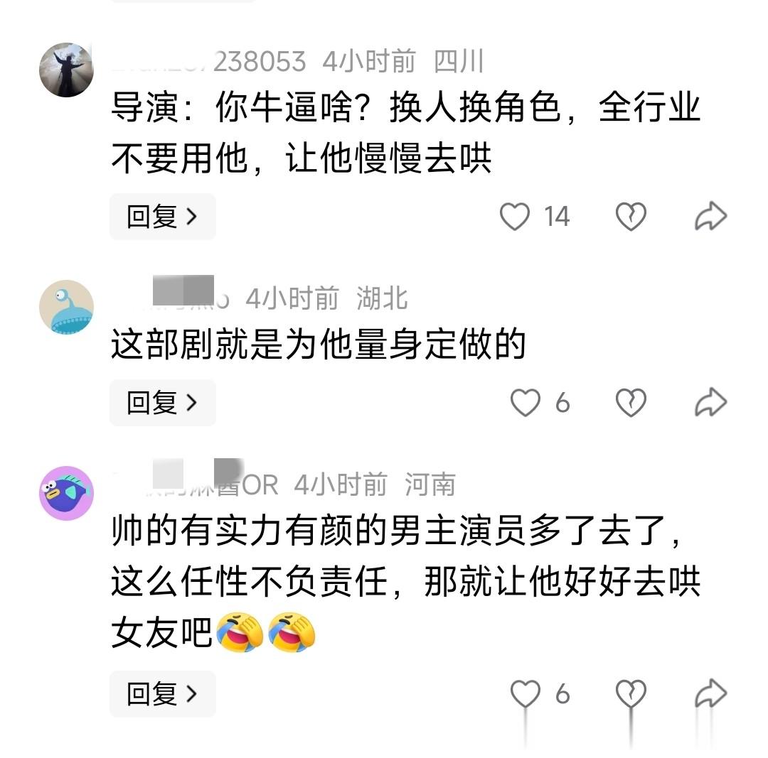 也有人给导演提意见:换人换角色。全行业不要用它,用它慢慢去哄吧。帅的,有实力,有颜值的男演员多的是了,现在这个这么任性,不负责任,不管大家死活的,那就让他慢慢的去哄他那个所谓的女朋友好了,如果没钱的话,看他那个女朋友还要不要他。