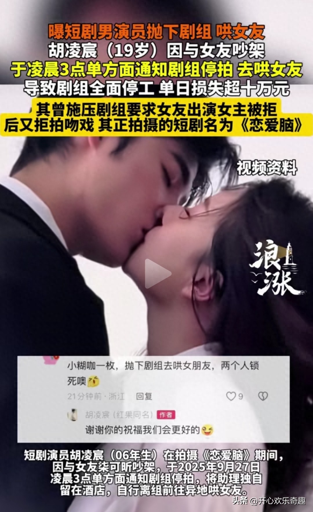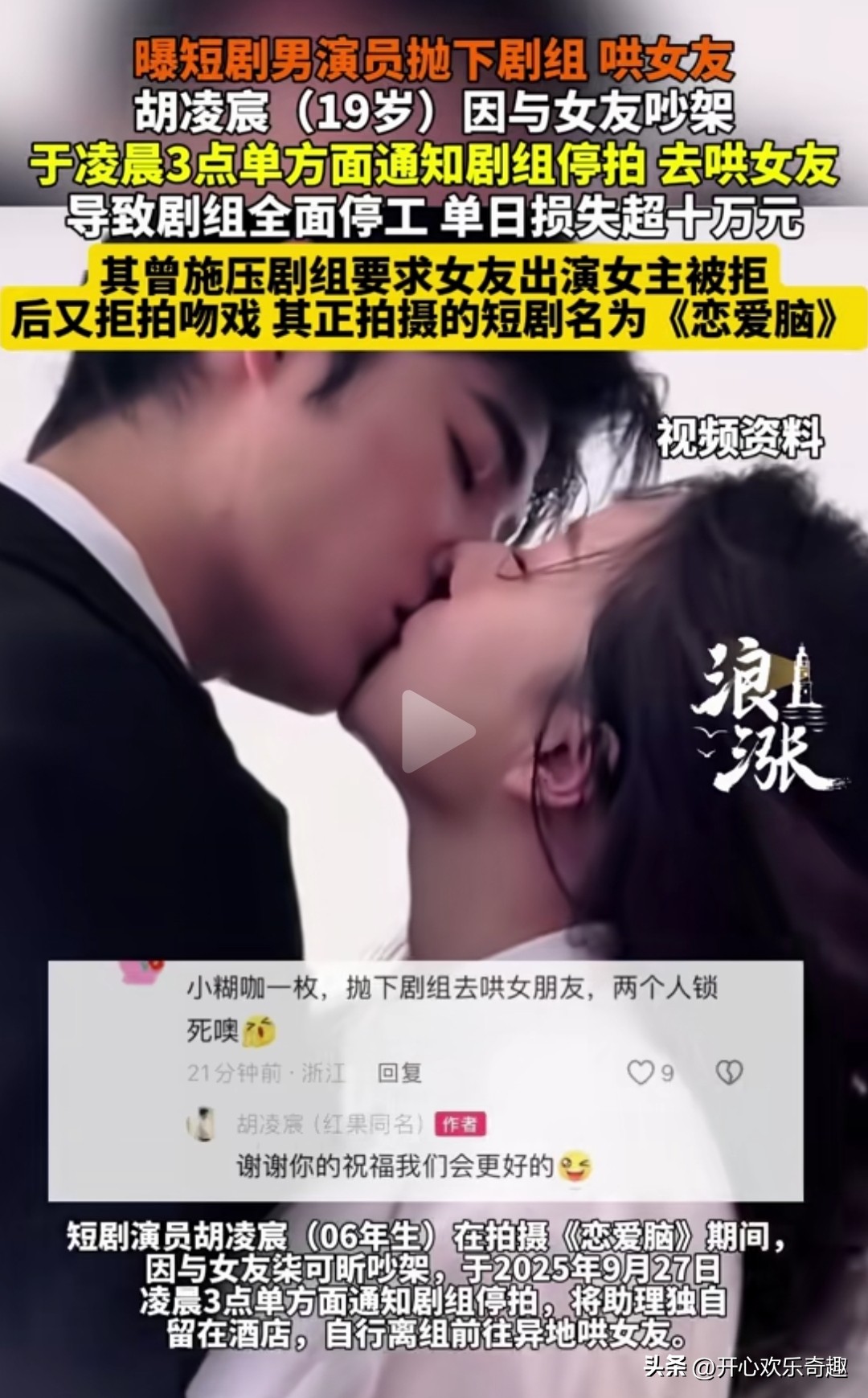他在拍摄这个短剧《恋爱脑》的时候,因为跟女朋友柒可昕吵架了,于是他在9月27号的凌晨3点单方面通知剧组停拍。把自己的助理独自留在了酒店,然后他自己离开剧组前往异地那个所谓的女朋友。