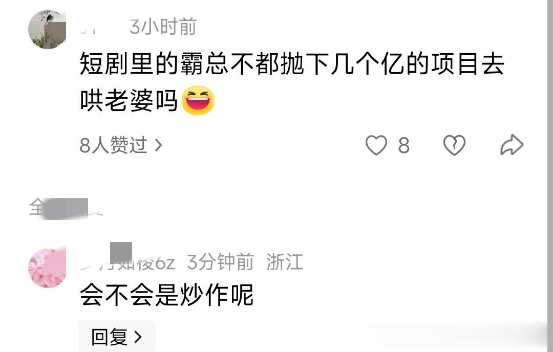 对于发生这样的事情,有的网友说,在短剧里面的霸总都是经常这样子的,抛下十几个亿的项目,然后一个劲的就去哄老婆,哄女朋友了。不知道这会不会是一种炒作了?