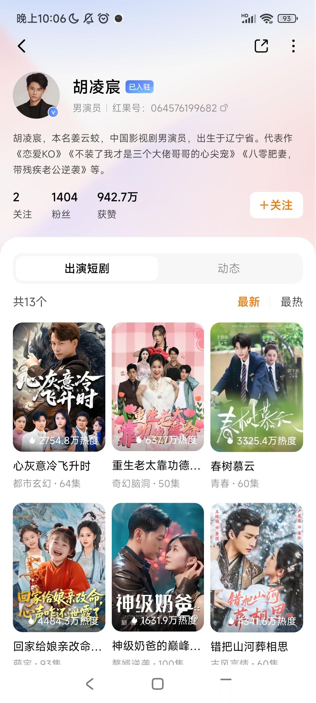 这个短剧男演员叫胡凌宸,2006年出生的。查了一下,他是辽宁人。粉丝才1000多一点,点赞量都还没过1000万。