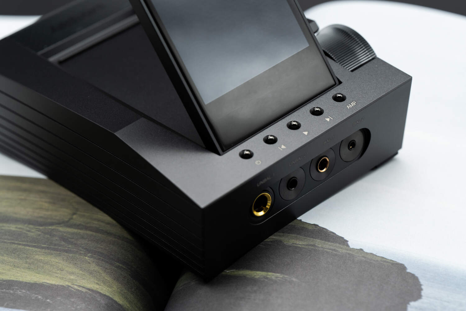 外观方面CA1000T仍然与CA1000轮廓大致相同,只是颜色更换为了更为稳重的灰黑色,整体一体感更强。屏幕放平的CA1000T看上去像辆跑车,不规则的流线造型,金属质感强烈。顶部屏幕周边的线条则带有AK家族化的光影设计视效,在不同角度的光线下能够呈现出不同的质感和明暗对比。屏幕前方一排细小但突出的物理按键承担了基础的操作任务。CA1000T的屏幕可在一定角度内自由“仰卧起坐”,根据用户日常使用它的位置来调节符合习惯的观看角度;屏幕后方是Astell&Kern的品牌logo,与众不同的是这个logo是一组镂空的RGB灯,充当着便携DAP型号中滚轮灯的作用,可以以不同色彩指示播放音乐文件的码率。而logo的“背景板”则是AK便携播放器背板常用的纹路。CA1000T机身右侧是一个AK播放器产品中有史以来最大的音量滚轮,并且内侧以中空设计+凹刻字体造就了一个别致的滚轮。至此,AK播放器产品中几乎所有的设计元素,CA1000T身上都有所提现,也变相彰显了它的“双重身份”。