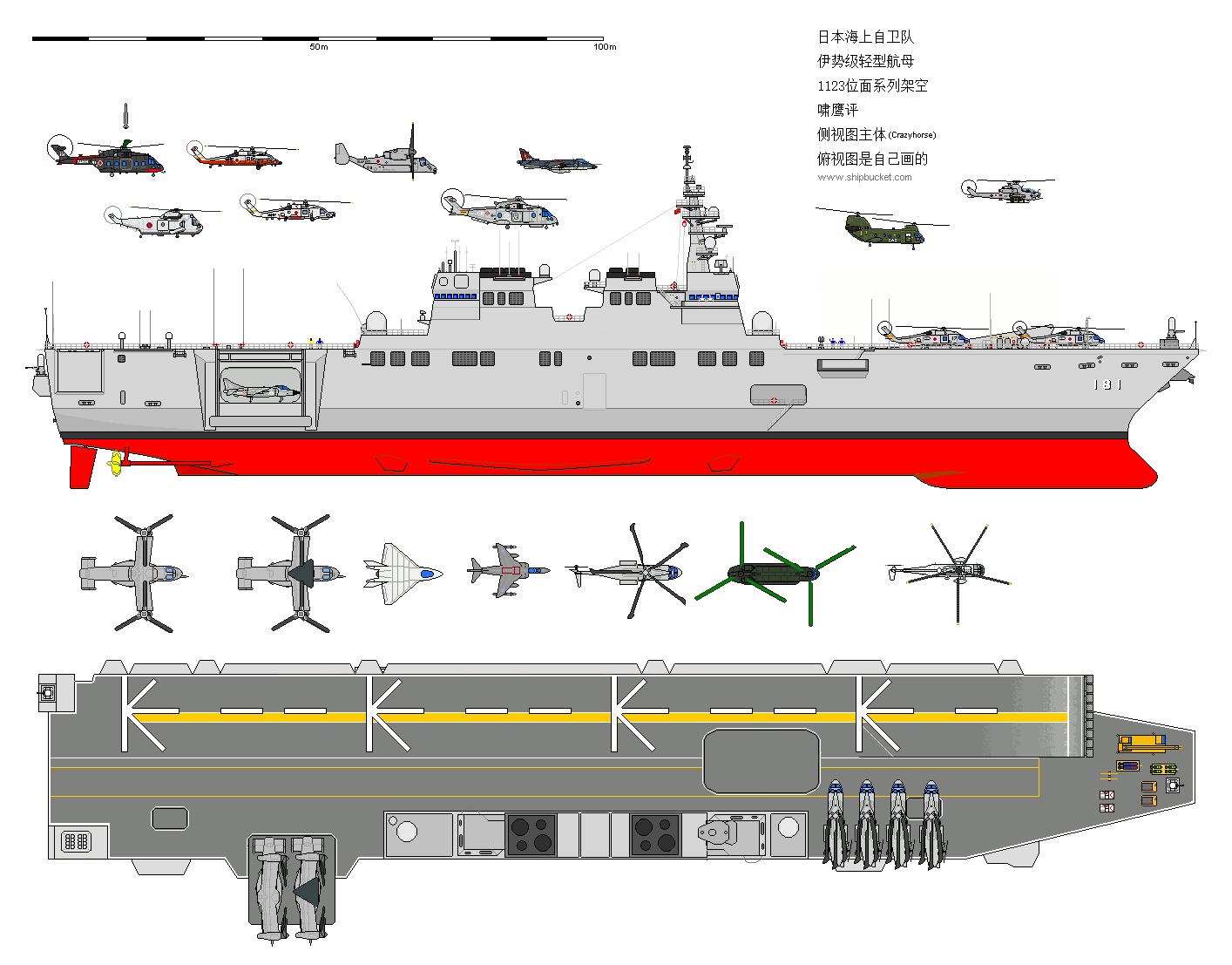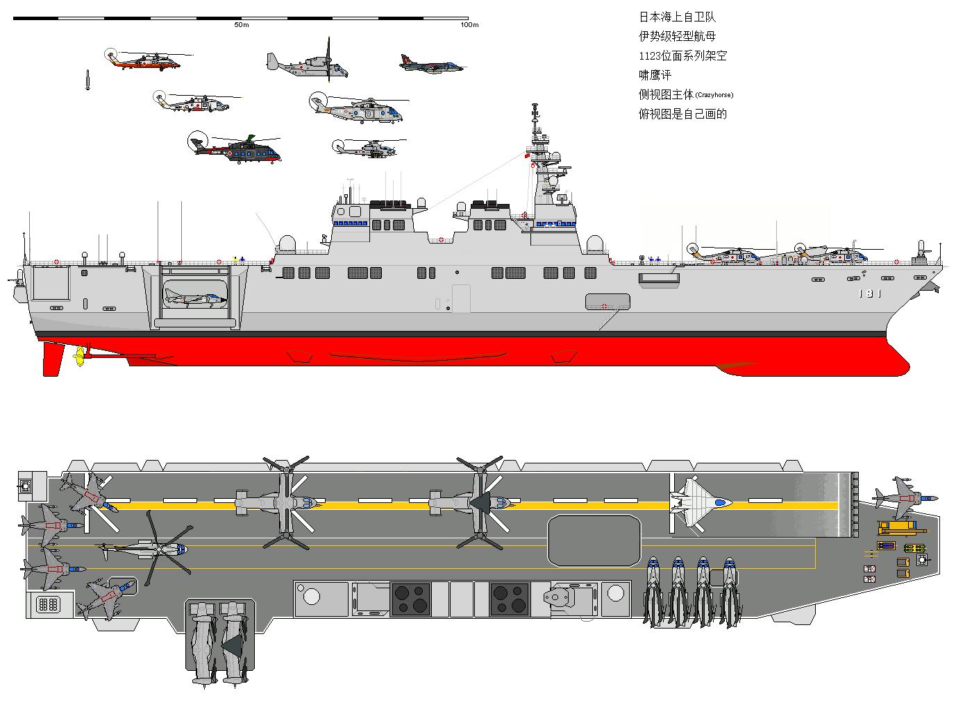 可行性分析与补充说明伊势级就是日向改,无非就是右侧的小艇库位置改成了侧舷升降机,加了个滑跃跳台,将升降机从前20*10,后20*13,调整为前20*13,后部为出云同款的长15米、宽14米,然后顺便调整了一下MK-41和近防炮的位置,仅此而已。