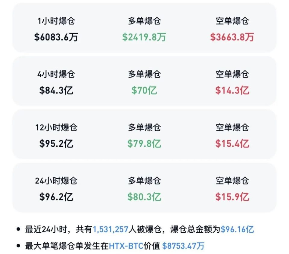 Coinglass数据显示,过去24小时加密货币市场共有超153万人被爆仓,爆仓总金额为96.16亿美元,其中多单爆仓80.3亿美元,空单爆仓15.9亿美元。