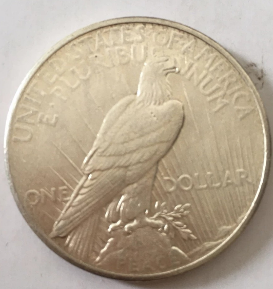 背面中央是一只展翅飞翔的白头鹰,白头鹰作为美国的国鸟,象征着美国的力量与威严。它的双翅展开,姿态矫健,仿佛正要飞向远方,寓意着美国在和平的环境下将继续向前发展。鹰的喙部叼着一条写有“PEACE”(和平)字样的飘带,直接点明了银币的主题。鹰的下方是橄榄枝,橄榄枝自古以来就是和平的象征,与白头鹰和飘带相互呼应,进一步强化了和平的寓意。币周上环为“UNITED STATES OF AMERICA”(美利坚合众国),下环为“E PLURIBUS UNUM”(合众为一),明确了银币的发行国家和美国的国家格言。