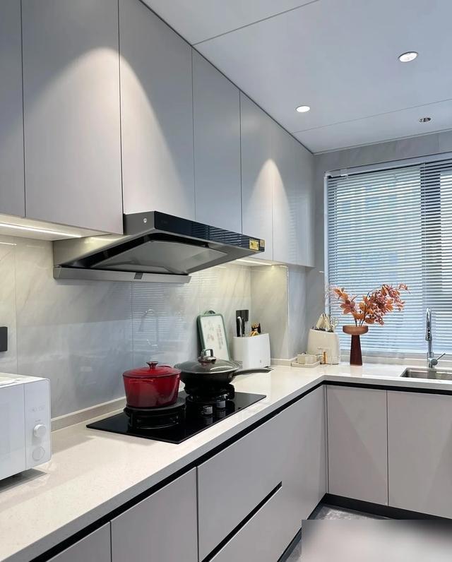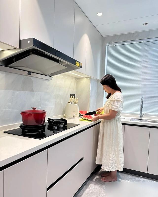 U型厨房动线像写好的代码洗切炒一条龙转身不打架石英石台面浅色耐脏台下盆一抹到底水渍顺流而下收拾跟开挂似的。