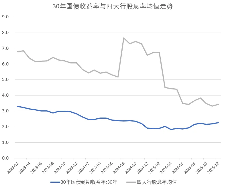 比如过去两年我们看到银行股和长债一起上涨,超长期国债利率则从3.5%下调到2%,四大行的股息则从过去两年的6%以上普遍降到了3%出头,利率-股息率曲线基本保持平行,