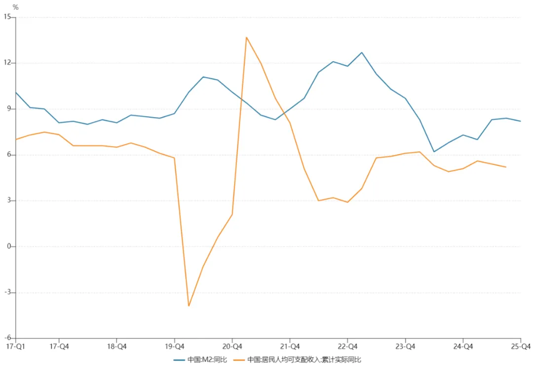 M2增速-蓝 居民可支配收入增速-黄 数据来源:wind