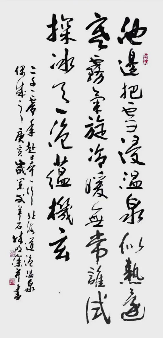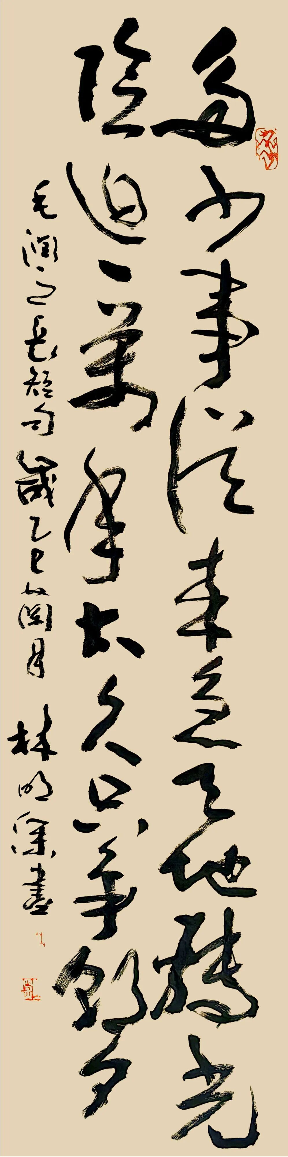 诸家帖学之融合,是当代书法家常常主张的创作路径。林明深先生之书功,亦不例外。看其书法,行草真气若幽兰吐纳,笔法既有张旭、米芾之纵逸,亦得兰亭序之清健、祭侄文稿之奔放激荡。落笔率意而法度隐现,字势奇峻不失雅正,满纸云烟犹可抒写诗词情怀,诚可谓文人言志、心手双畅,令人叹赏!如此,其书是既集众家之美,又更具古人之心志也。要知道,寻常习书者,能精通一家已属不易,但像林明深先生这般能融汇帖学而自出新意者,就必然是要有至深至极的精研之思与参透之心。若非如此,写出的书法恐难免拼凑堆砌之弊,显得不伦不类。