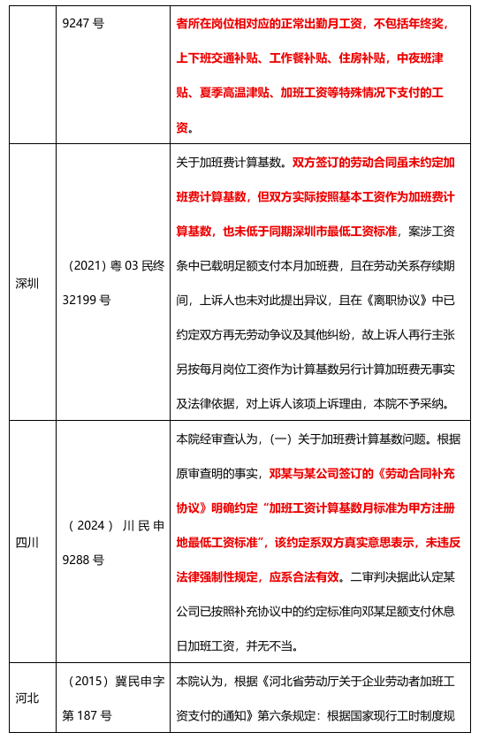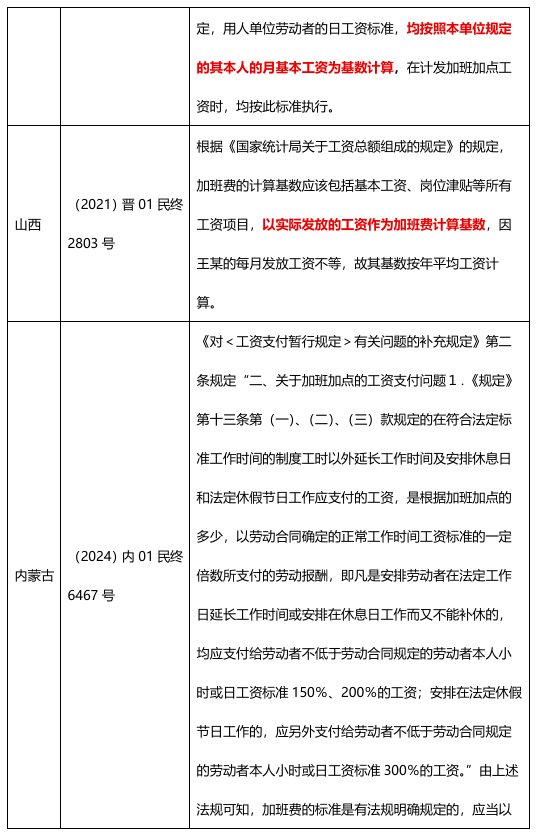 (一)北京地区,京高法发〔2024〕534号《北京市高级人民法院、北京市劳动人事争议仲裁委员会关于审理劳动争议案件解答(一)》第57条:劳动者加班费计算基数,应当按照法定工作时间内劳动者提供正常劳动应得工资确定,劳动者每月加班费不计到下月加班费计算基数中。具体情况如下: